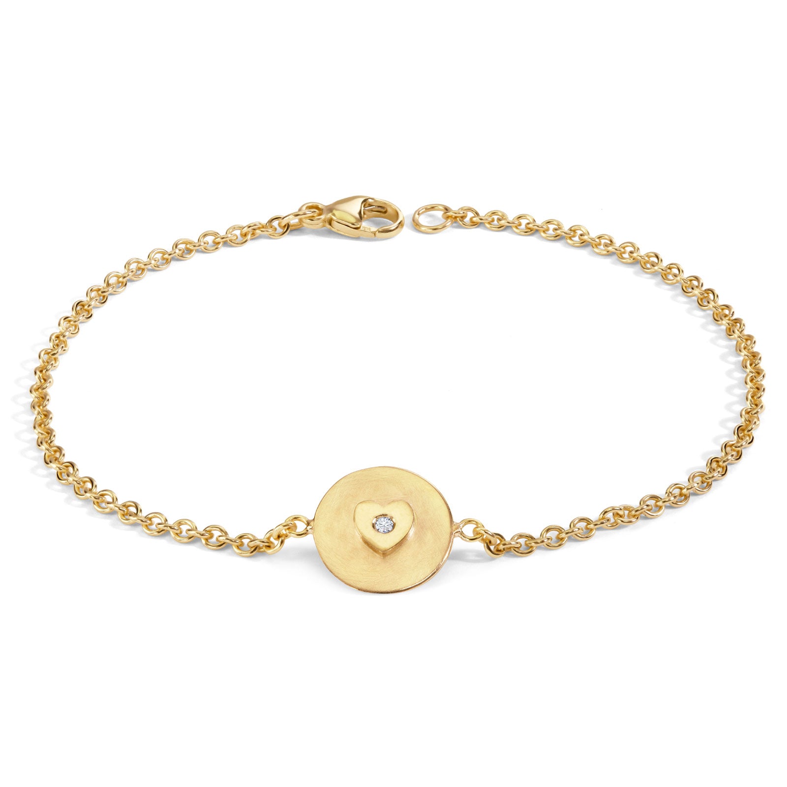 7" 2mm yellow gold charming bracelet with a mini yellow gold round charm with a high polished yellow gold raised heart and a 1.5mm white diamond in the center.