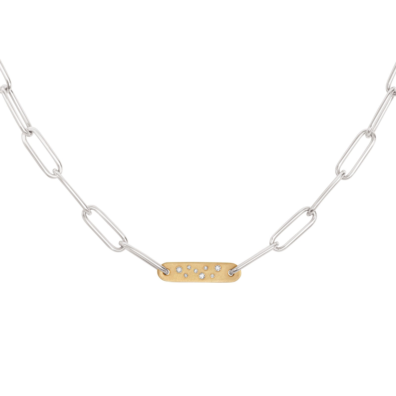 5.2mm silver link chain with a small yellow gold flat bar, scattered with white diamonds.