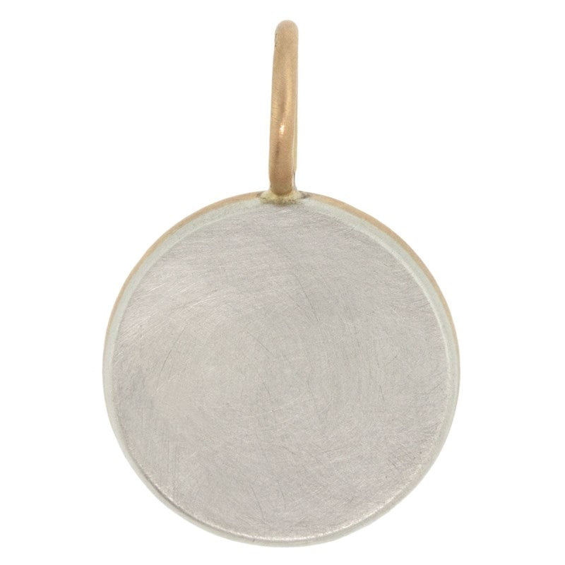 Mini silver round charm with a yellow gold wide frame and 1.5mm white diamonds. Hand stamped with “Queen Bee” and a bee.