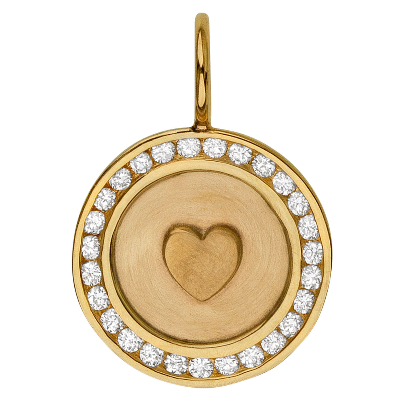 Mini yellow gold round charm with a channel set frame and a yellow gold raised heart in the center. A channel set frame featuring your choice of luxurious white diamonds, pink sapphires, yellow sapphires or blue sapphires to add a sparkle to any occasion.