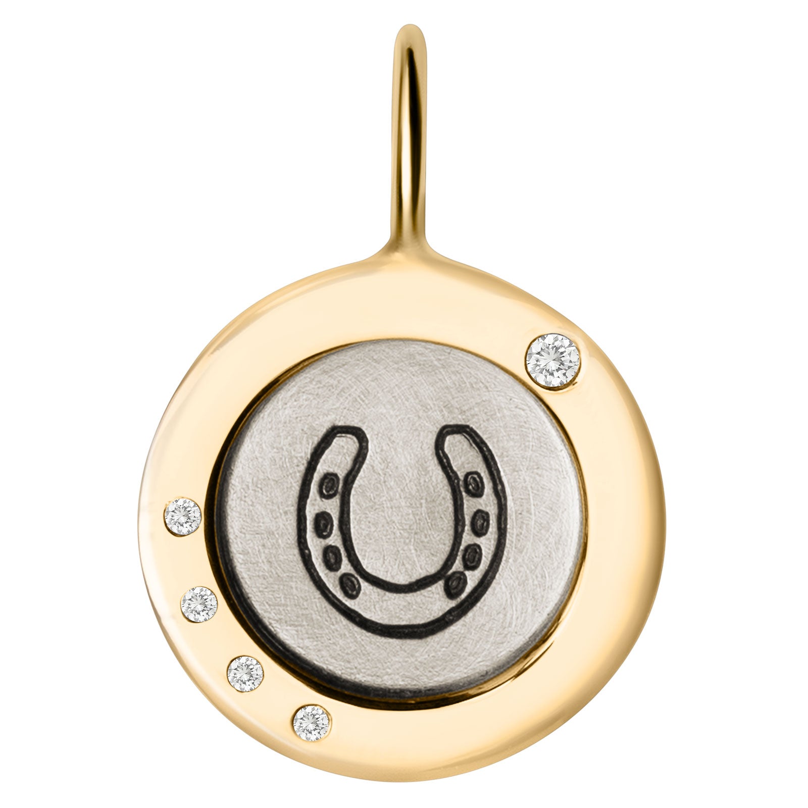 Add luck to your wardrobe with this beautiful handmade charm. Crafted from silver, this round charm features a 14k gold wide frame with a lucky horseshoe and white diamonds for added sparkle. Wear it for a touch of good fortune.