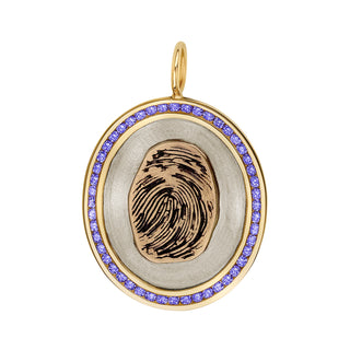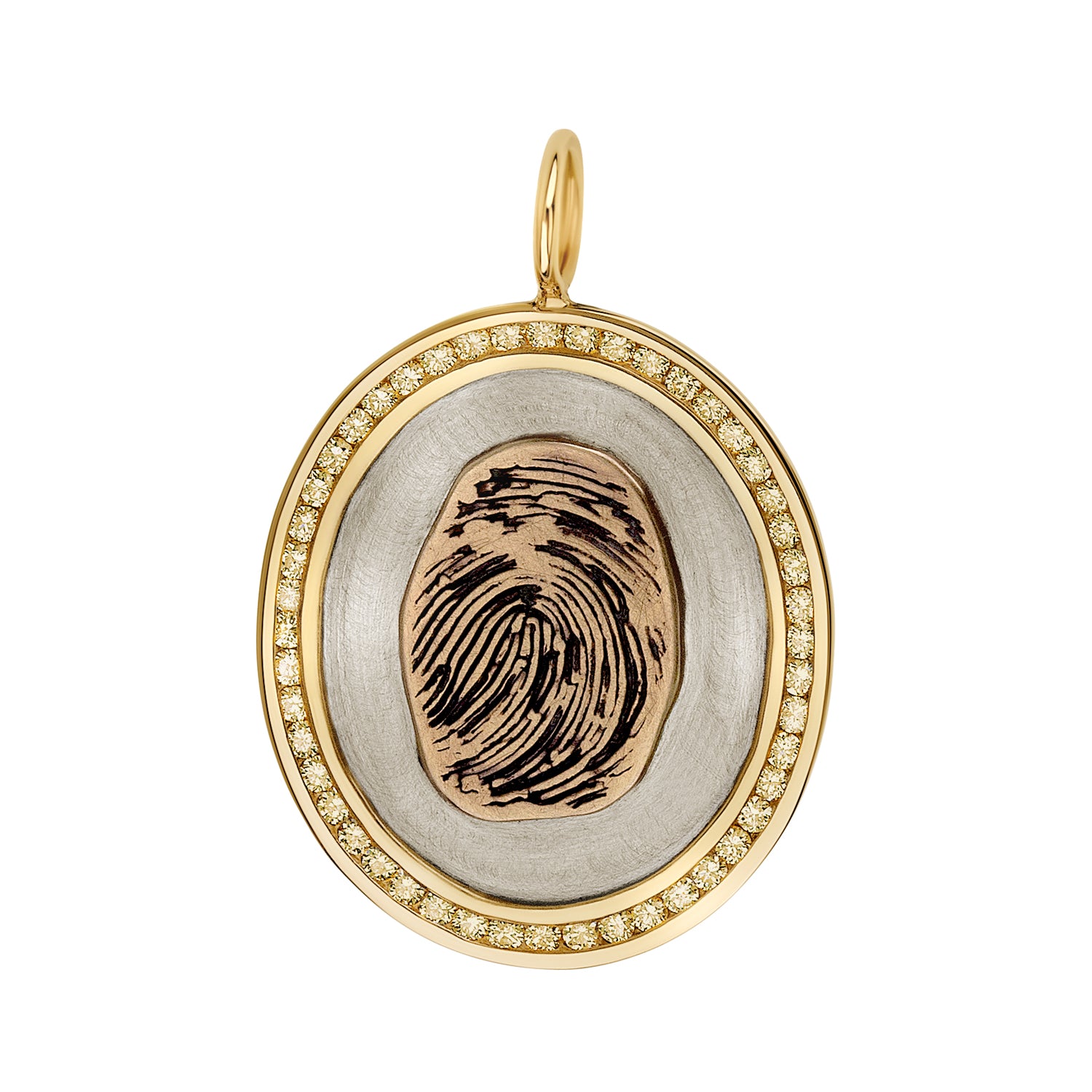 Medium white gold oval charm with a yellow gold channel set frame your choice of white diamonds, pink sapphires, yellow sapphires or blue sapphires. Adorned with a hand cut stamped raised yellow gold fingerprint. Hand stamped with a name on the back.