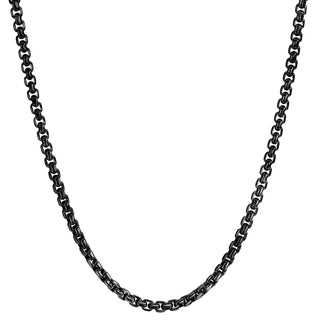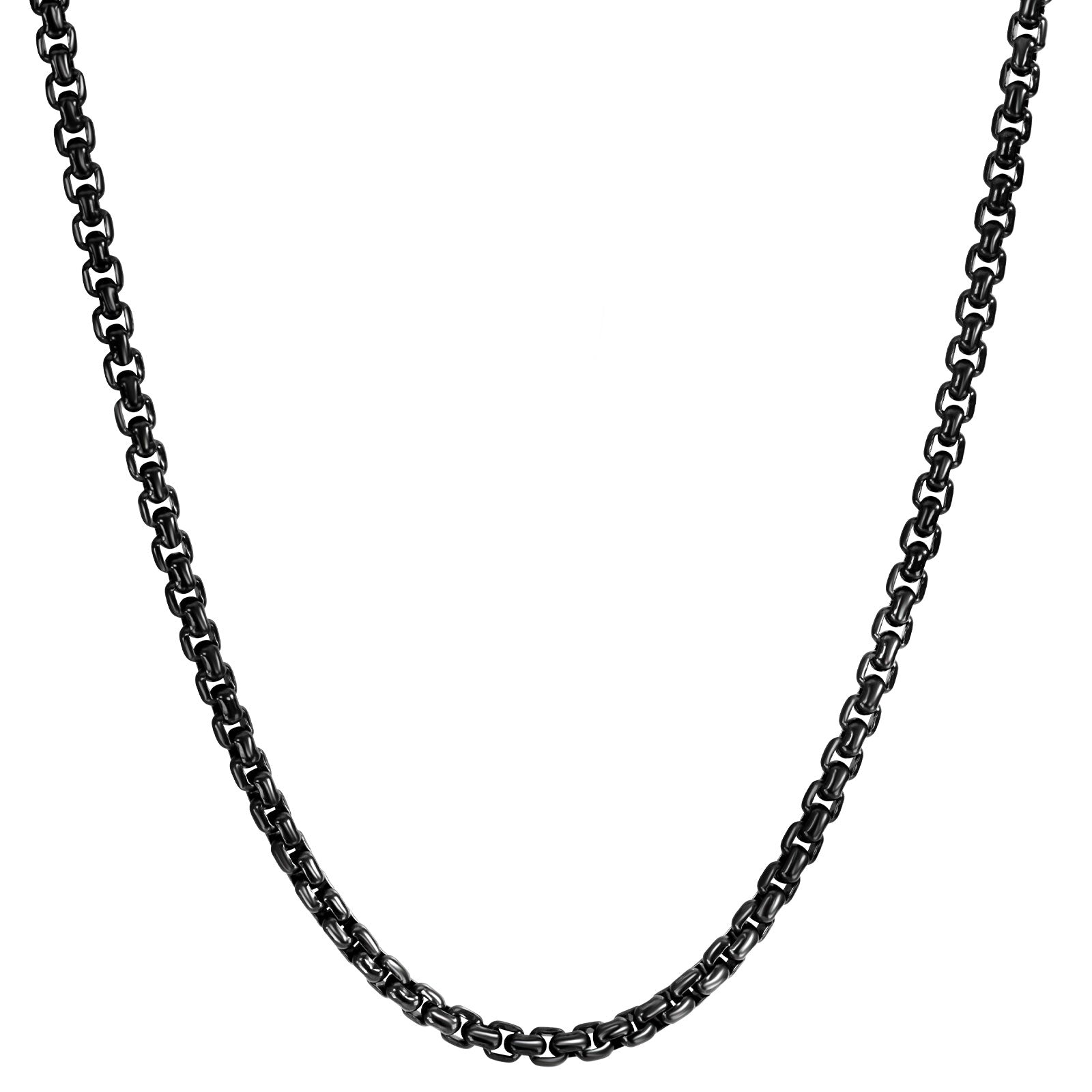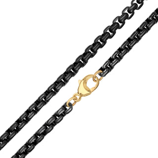 4mm stainless steel black chain with yellow gold hardware. Should you need a custom length, please contact us.