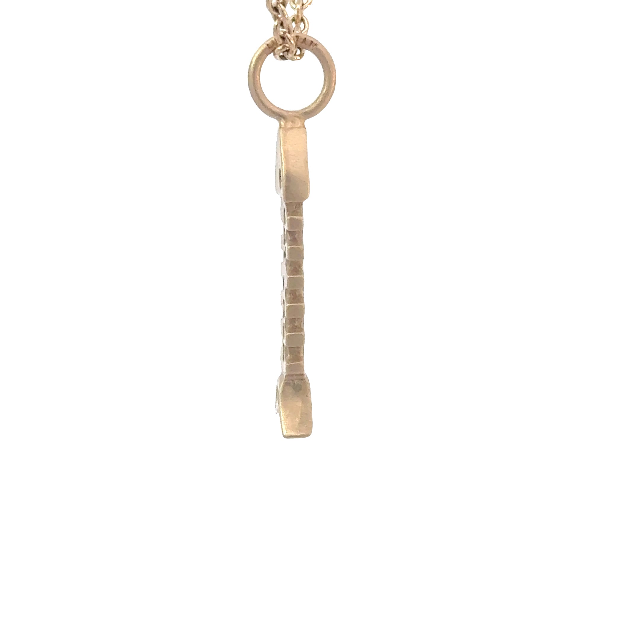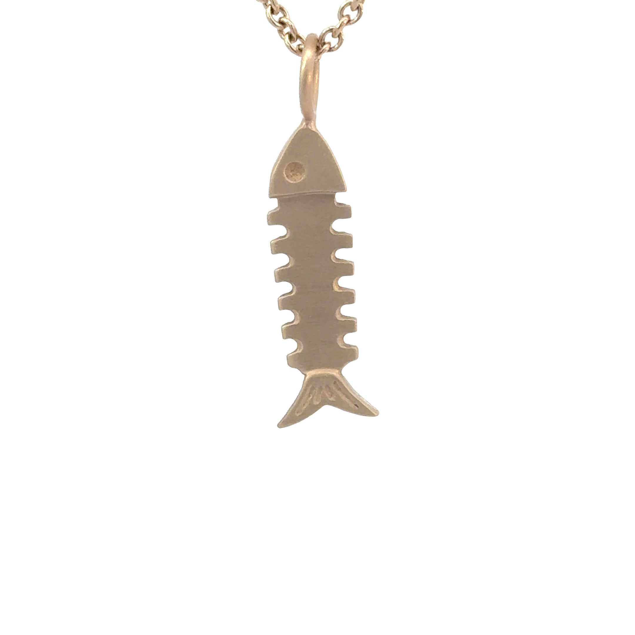 Yellow gold fish bone with one 1mm white diamond. Hand stamped with "Cat Mom".