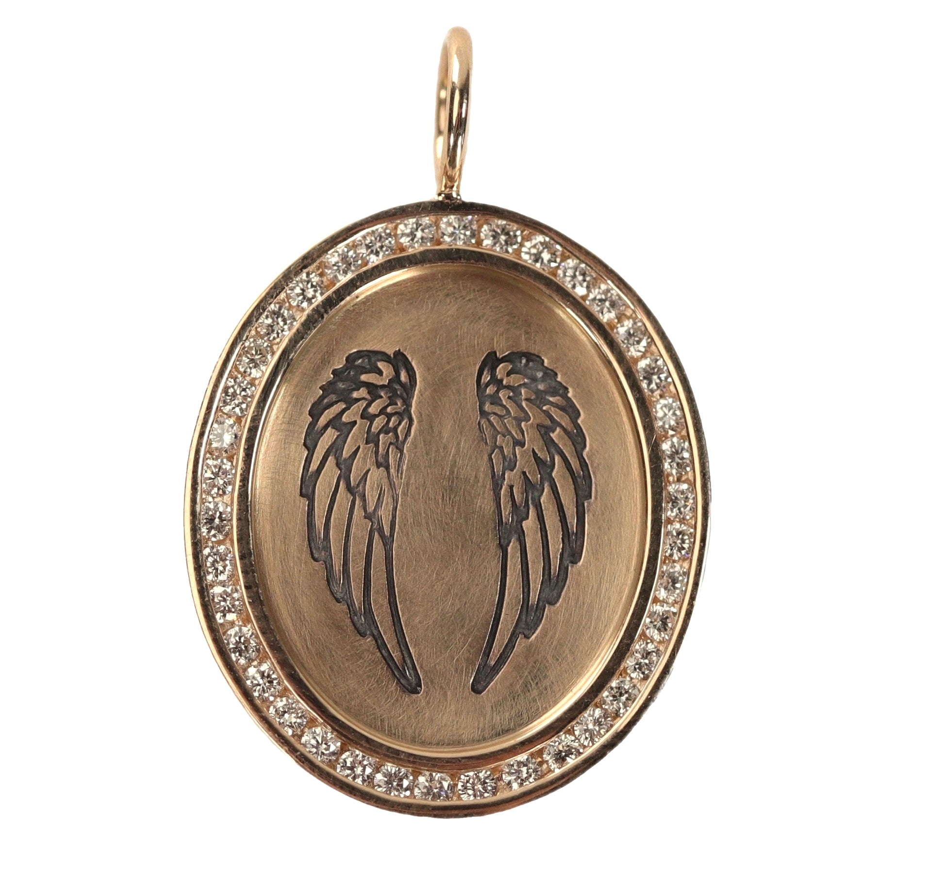 Small yellow gold oval charm with a yellow gold channel set frame with white diamonds. Hand stamped with a pair of angel wings.
