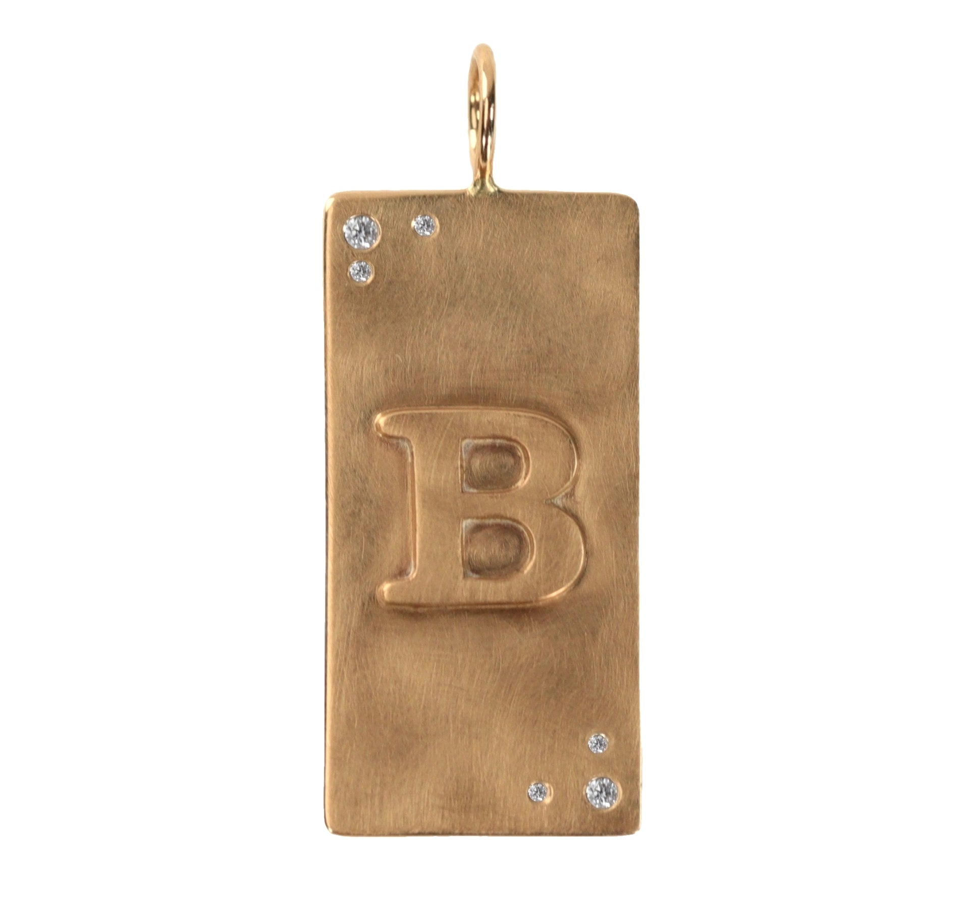 Medium yellow gold ID tag with a yellow gold raised initial of your choosing accented by (4) 1mm white diamonds, and (2) 1.5mm white diamonds.