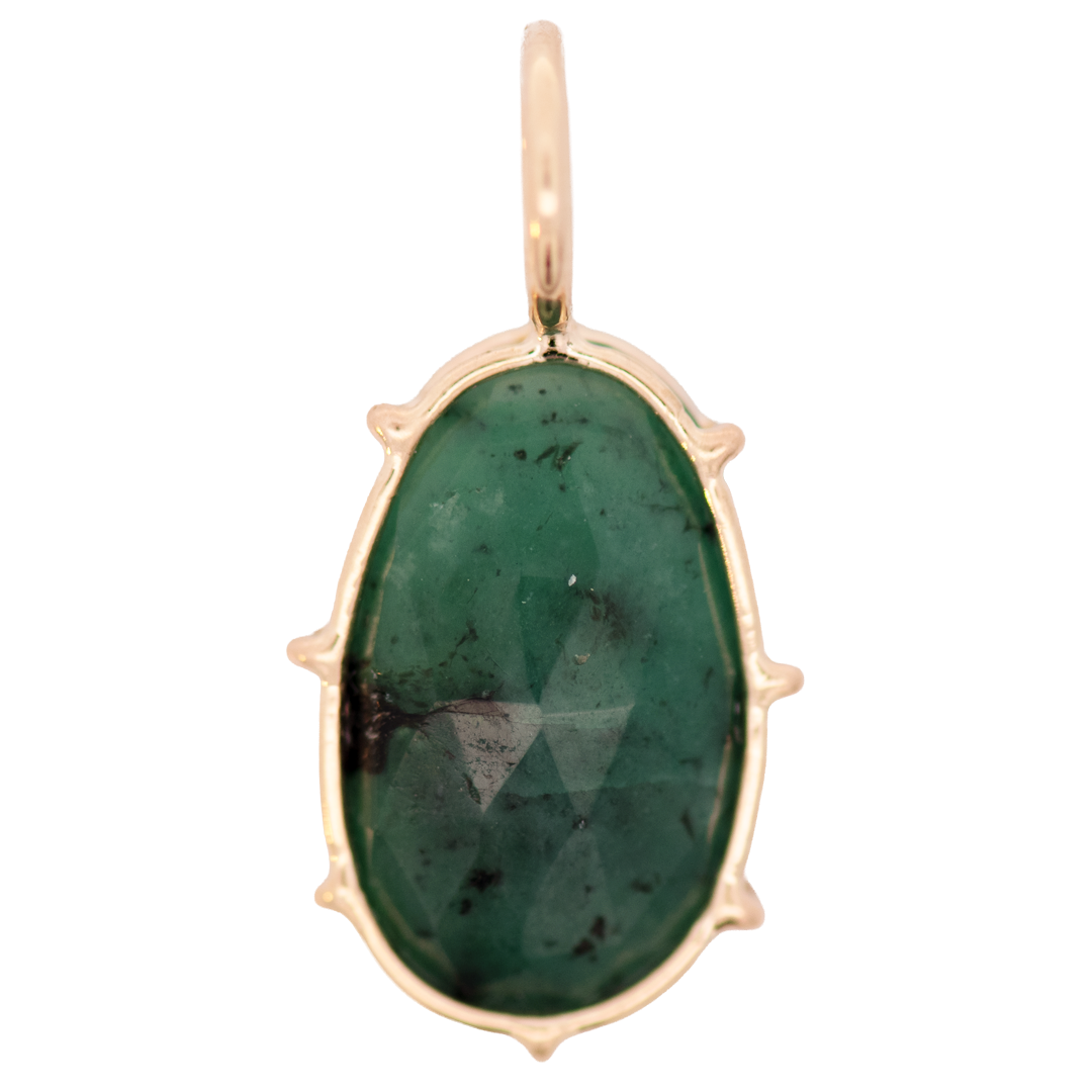 Small emerald Harriet Stone wrapped in 14k Yellow Gold wire. Emeralds can symbolize rebirth, growth, and prosperity. Each Harriet Stone is unique, and once this stone is sold there may not be another like it.