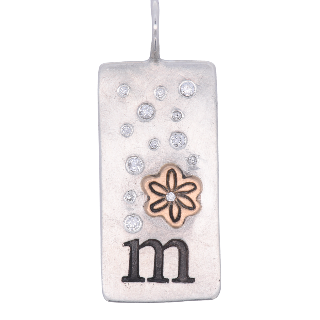 Small silver ID tag with a stamped raised yellow gold daisy with a 1mm white diamond in the center and a scatter of seven 1mm and five 1.5mm white diamonds. Hand stamped with a the initial off your choice.