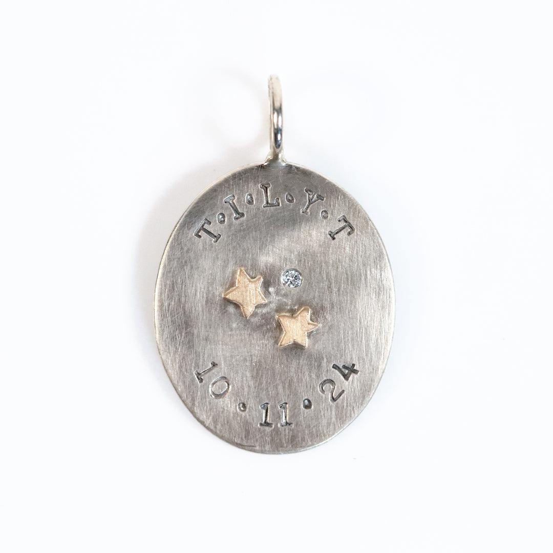Medium silver oval charm stamped with initials in a repeating pattern and crafted with a 14k yellow gold compass adorned with a 1.5mm white diamond. The back is stamped with a wreathed date and set of initials or an abbreviation of your choice. The back center features two small raised 14k yellow gold star accents and a 1.5mm white diamond.