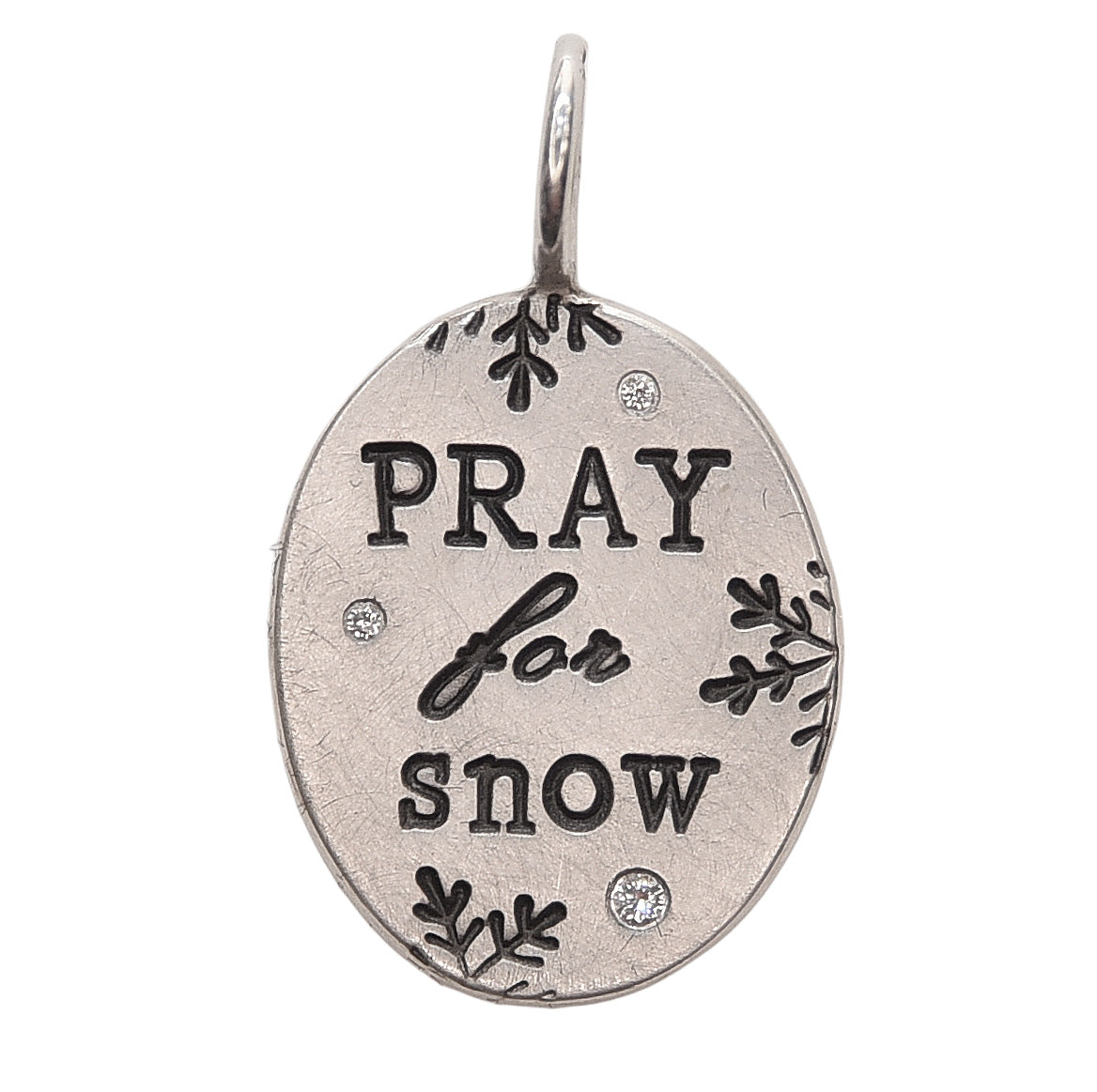 For the snow lovers and adventurers that LOVE a snow day: this fun sterling silver charm features stamped snowflakes and sparkling diamonds floating around the phrase "Pray for Snow". Let the adventure begin!