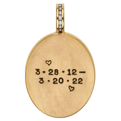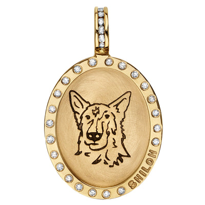 Crafted with care from solid 14k yellow gold, this stunning oval charm is the perfect way to honor your beloved pet. A diamond studded frame and luxurious channel set jump ring elevates this charm to new heights. Personalized with a custom stamp made from your dog or pet's portrait, your pet's name, and dates on the back for a touching keepsake that you'll treasure for life.