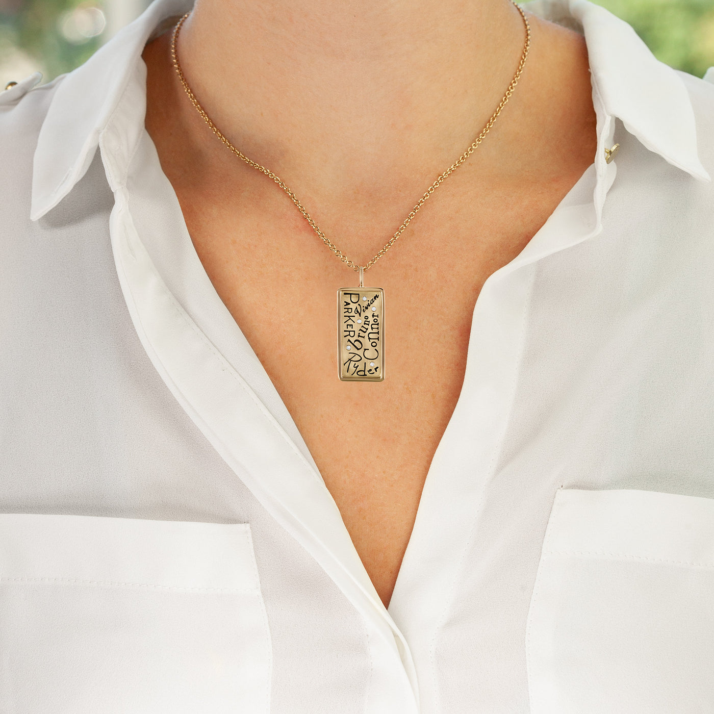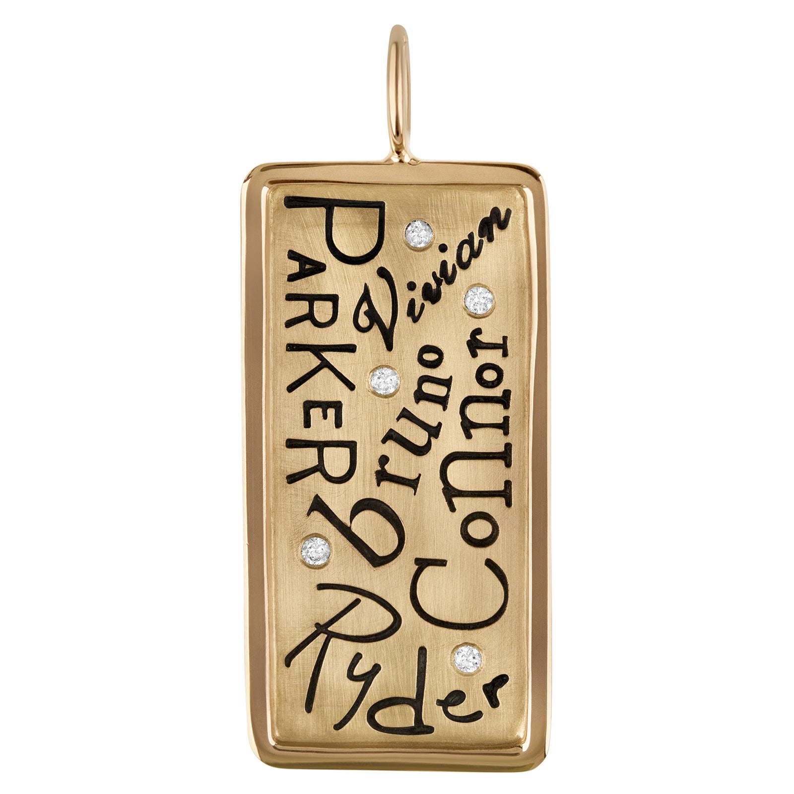 Medium yellow gold ID tag with a yellow gold frame, a cluster of 1.5mm white diamonds on the front, and two rose gold open hearts on the back. Hand stamped with multiple names in a graffiti layout on the front and multiple dates on the back.
