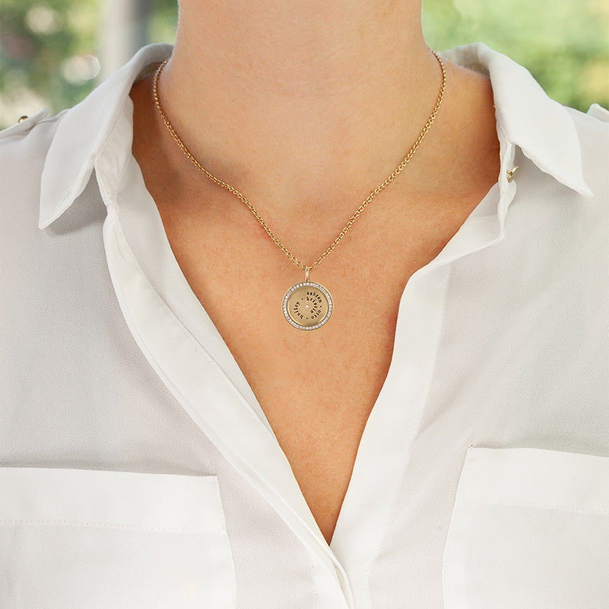 Medium yellow gold round charm with a yellow gold channel set frame with white diamonds and a 1.5mm white diamond in the center. Hand stamped with multiple names in a spiral layout.