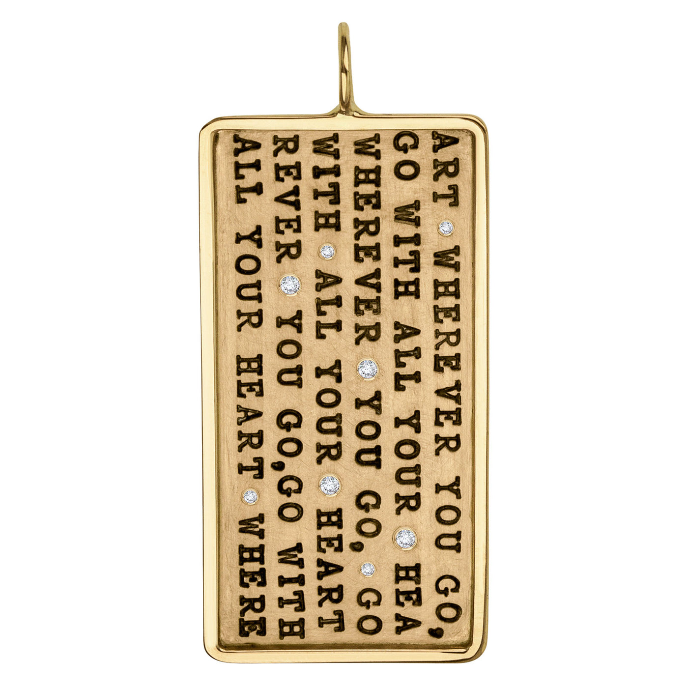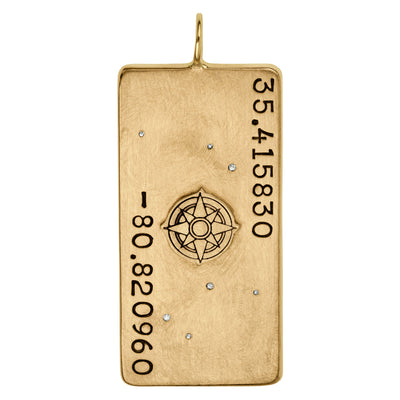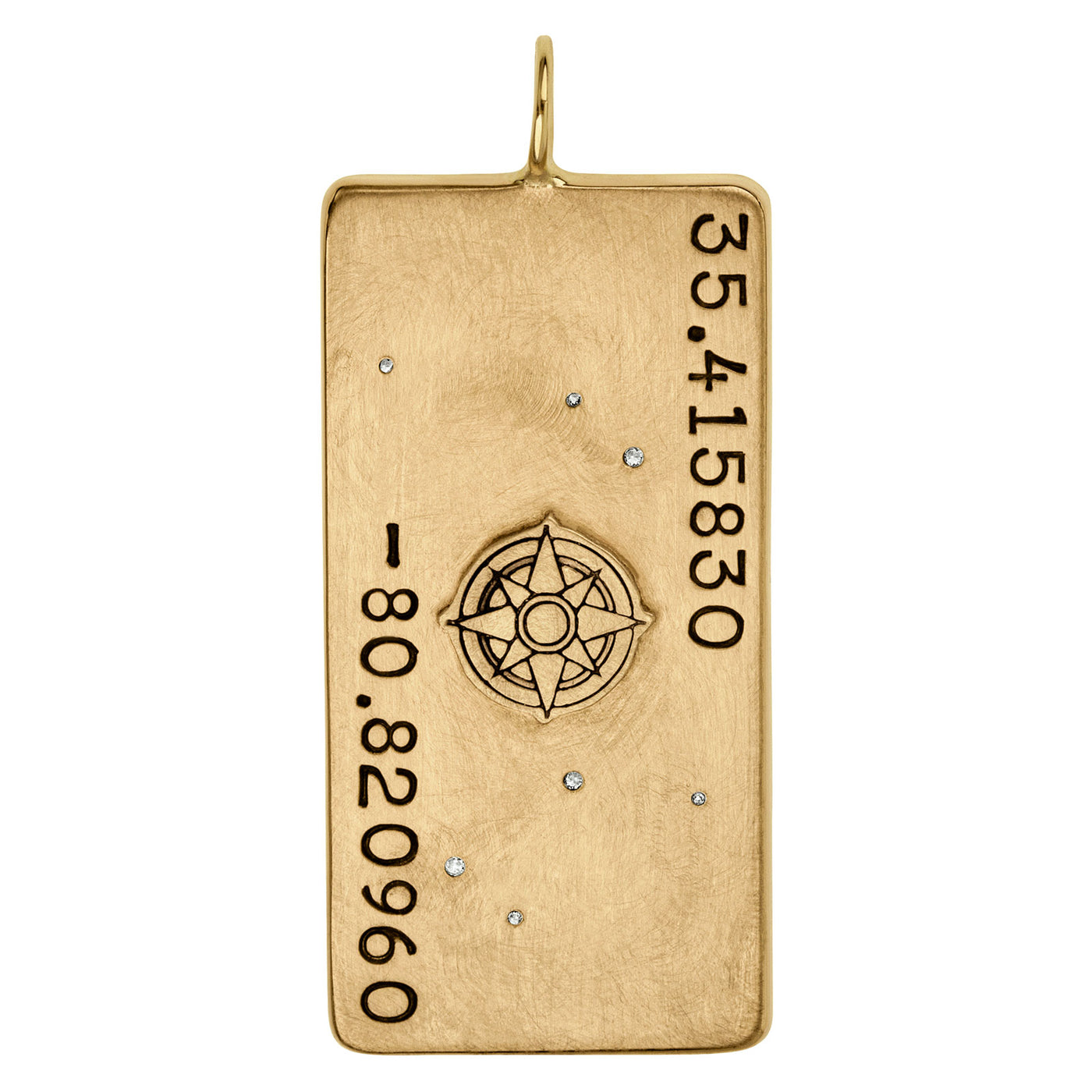 Indulge in our handmade ID tag, crafted with 14k yellow gold and featuring a yellow gold frame and beautiful white diamonds. A gorgeous yellow gold compass rose and personalized coordinates complete this elegant piece, perfect for keeping your destination close to your heart. Wherever you go, go with all your heart.