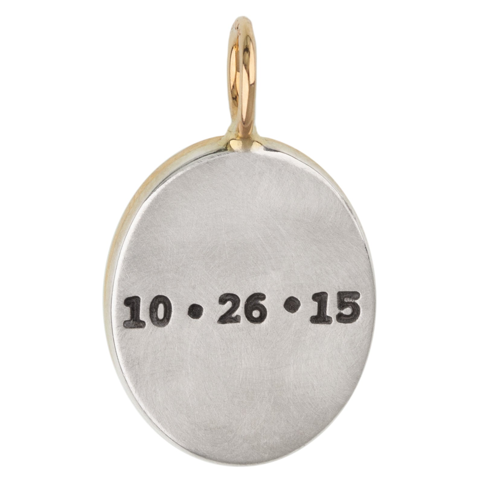 Capture a unique moment with our single initial and heart oval charm. Delicately crafted by hand, this elegant charm offers a personal touch, with your initial hand stamped on the front and a special date on the back. This timeless silver charm with its solid 14k gold frame and dainty heart will shine forever in your memory. What moment will you hold close?
