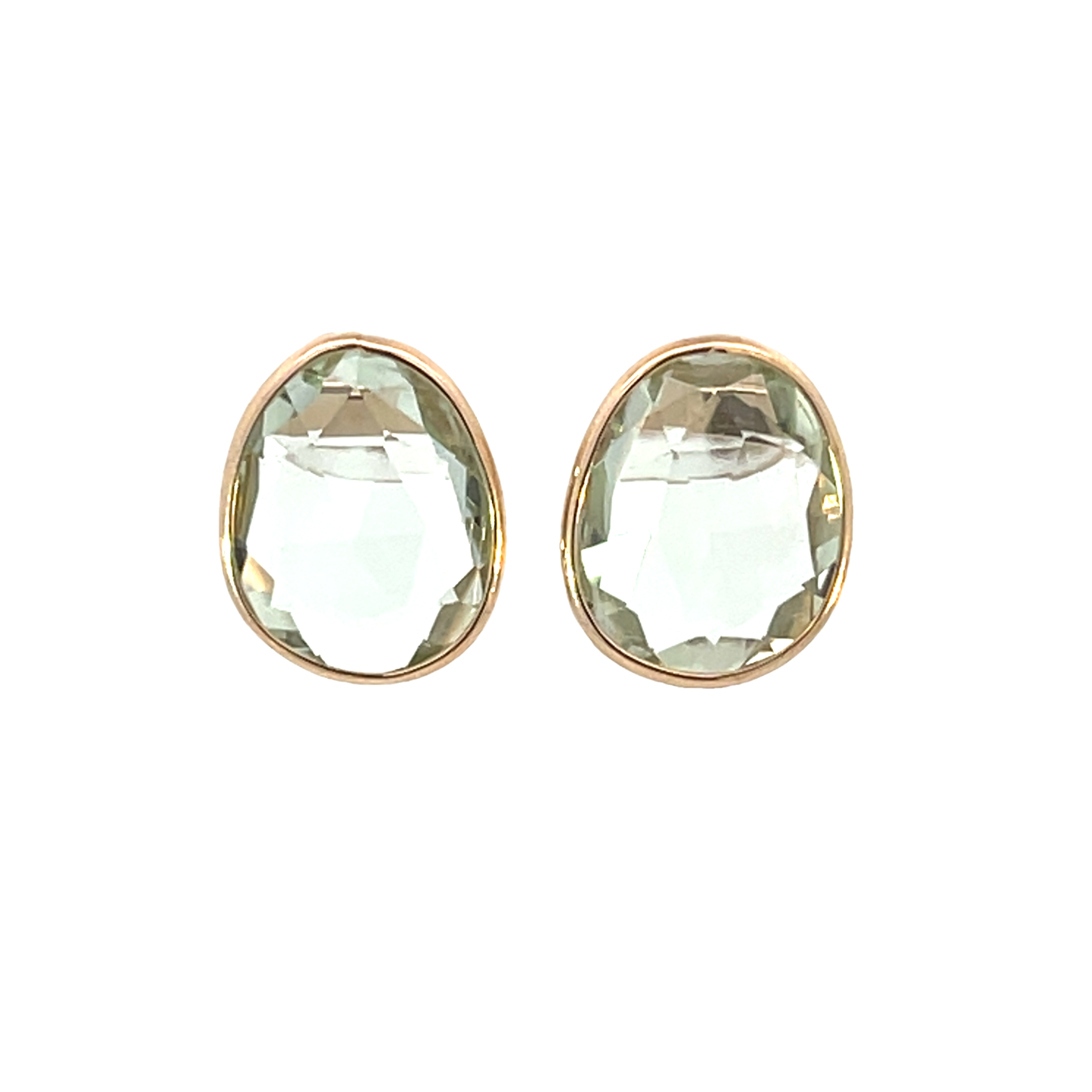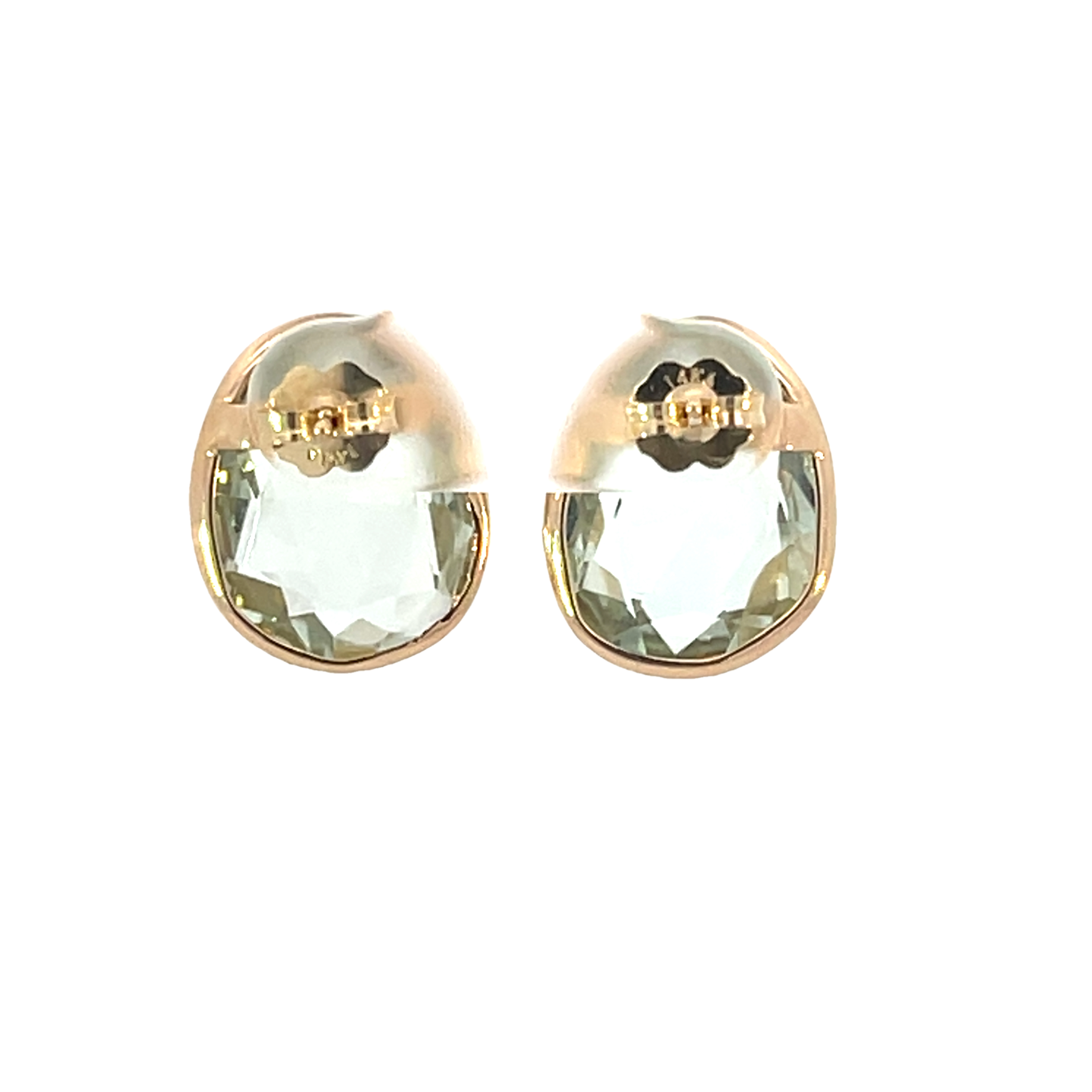 Sparkle and shine with these beautiful green amethyst Elizabeth Stone post-back earrings. Each earring contains one stone encased in 14k yellow gold - perfect for both casual and formal occasions.