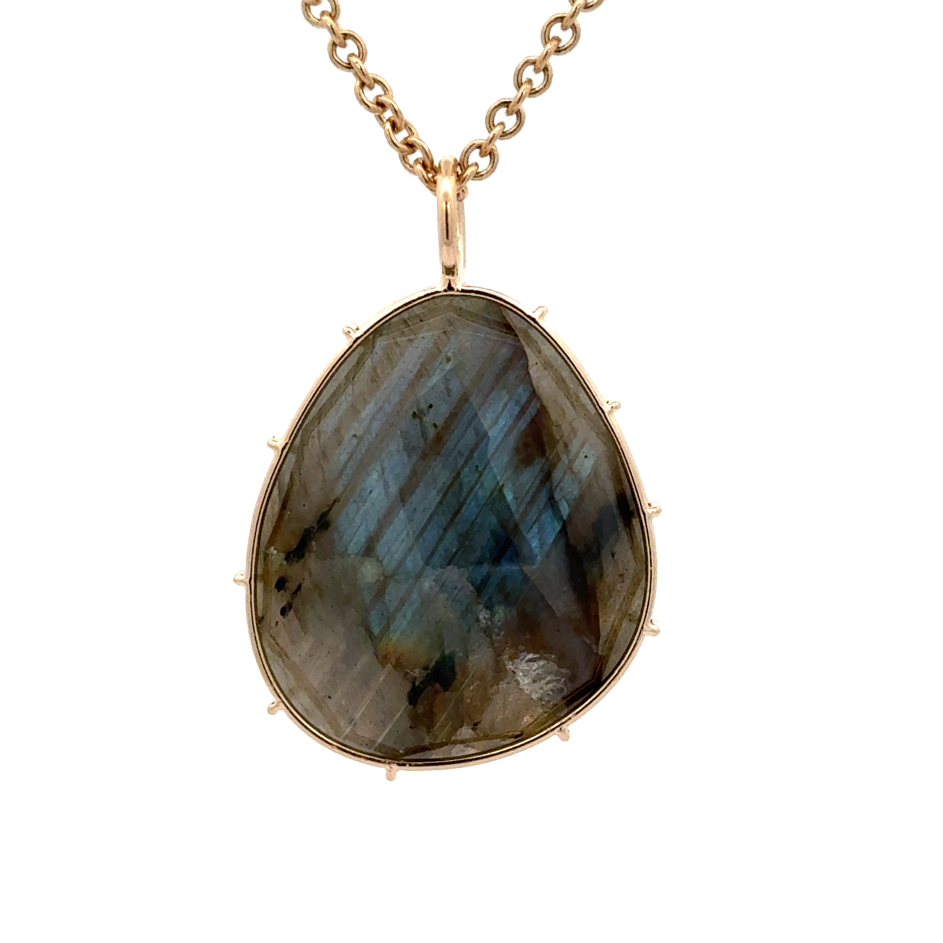 Large labradorite Harriet Stone wrapped in yellow gold wire. The stone shown is the stone you will receive. Each Harriet Stone is unique, and once this stone is sold there may not be another like it.
