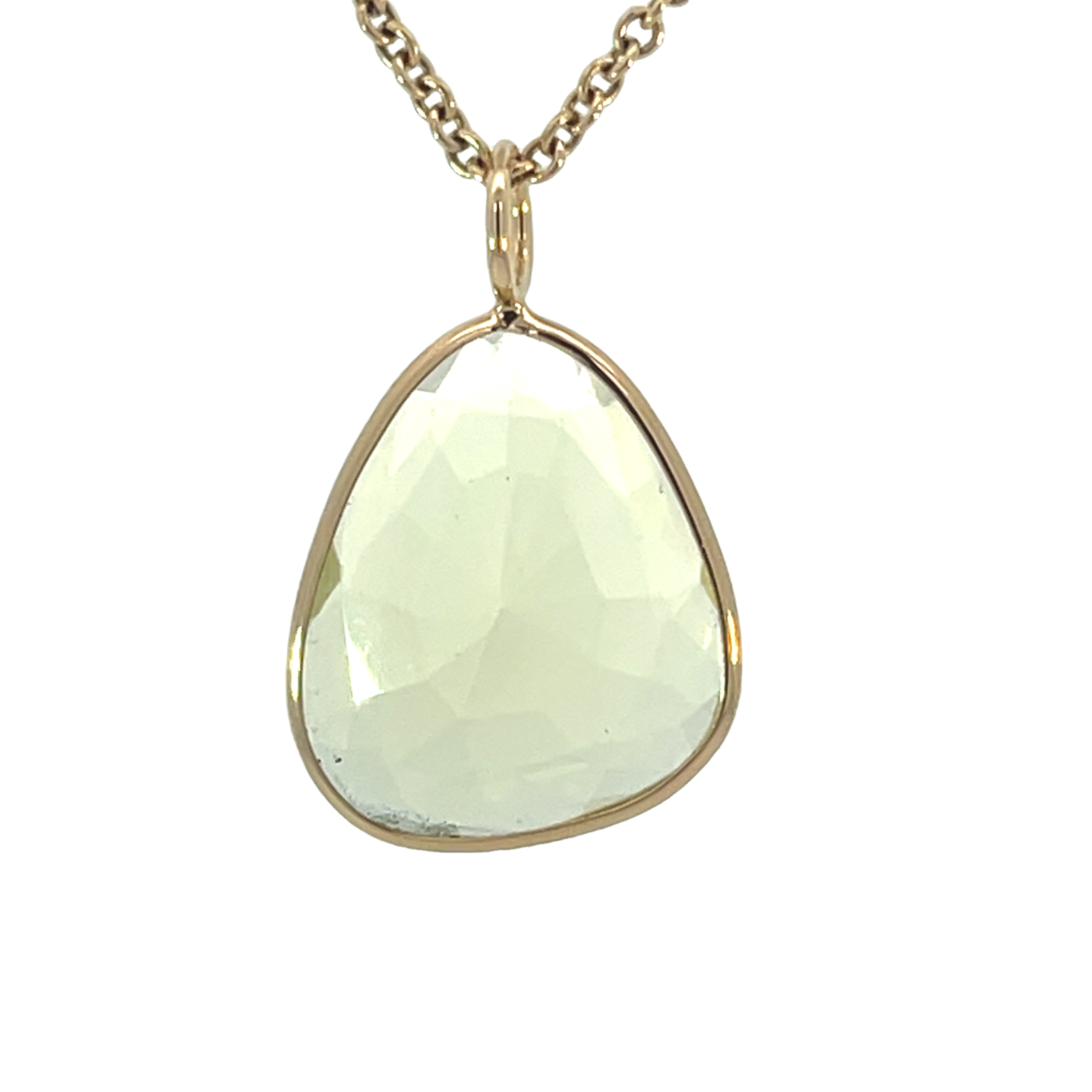 This one of a kind lemon quartz is wrapped in a yellow gold Elizabeth frame. It is a one-off stone, and once it is gone, it is gone forever.