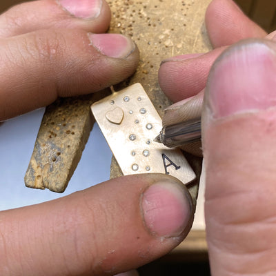 Heather's team of skilled artisans use a freehand technique, hand-stamping each letter, number, & symbol onto the jewelry. This attention to detail ensures that every piece is unique and holds a special meaning for its wearer.