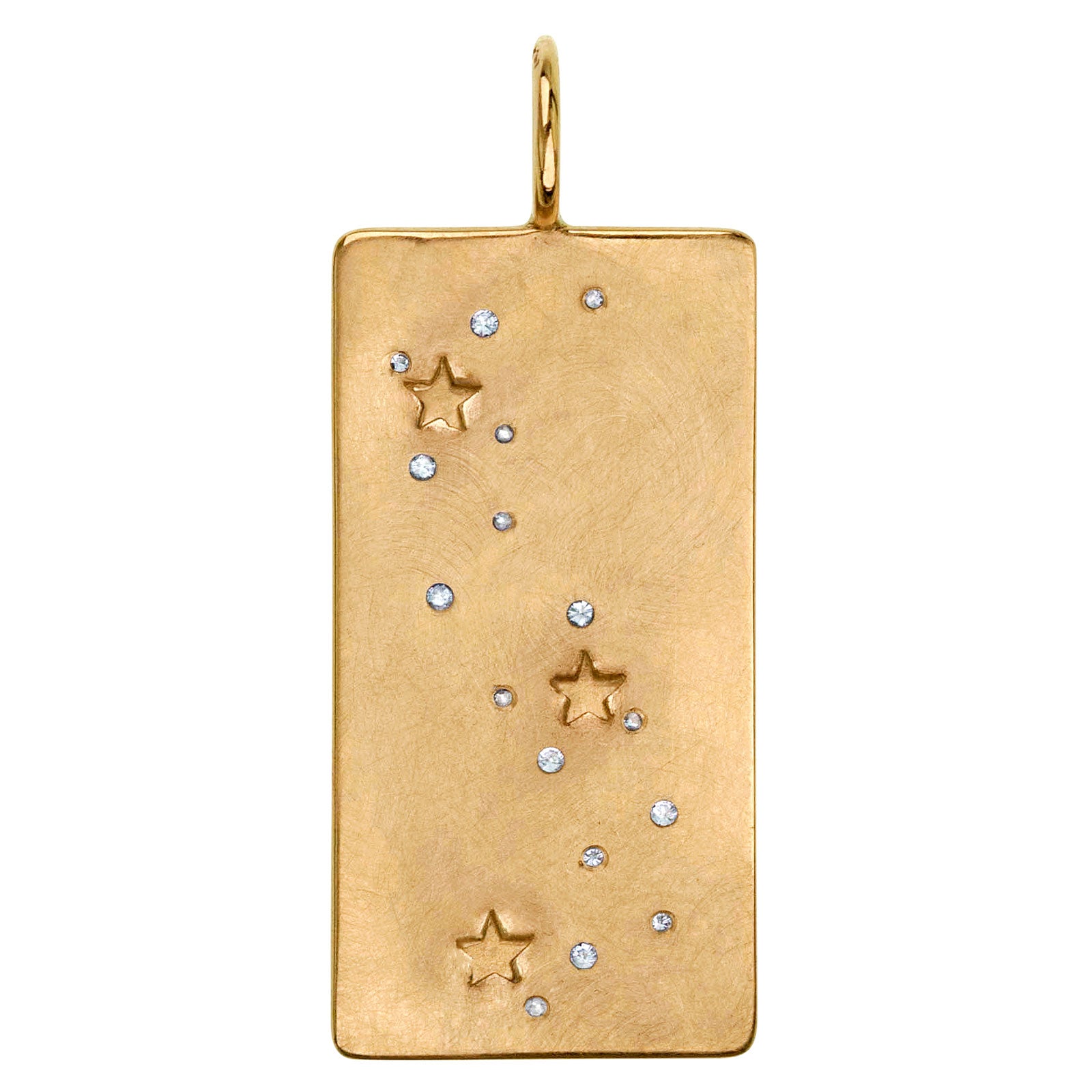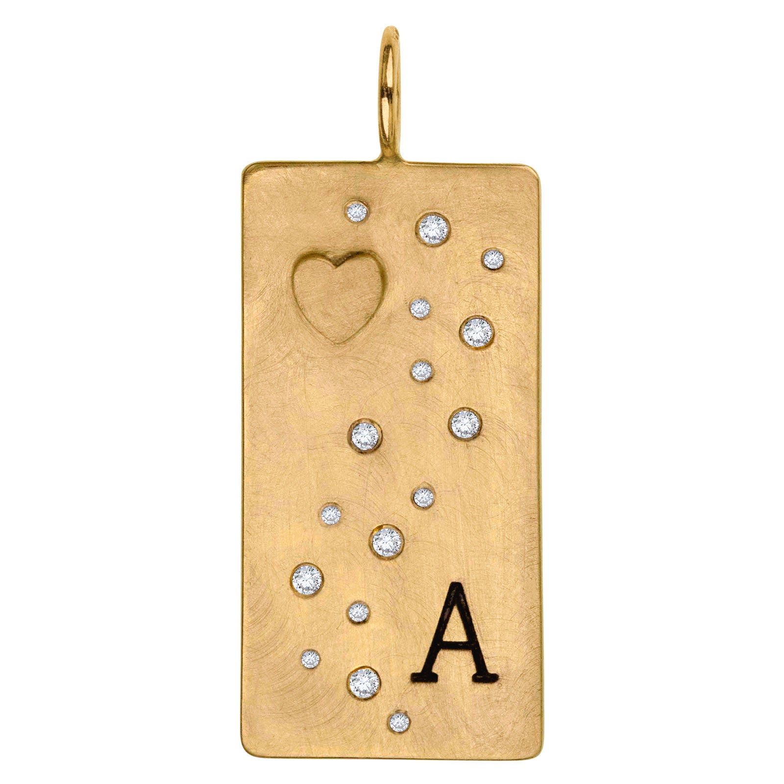 Personalize your collection with this unique ID tag! Embellished with white diamonds and a hand-cut heart on the front and stars on the back. This solid 14k gold charm is hand stamped with an initial. Dare to be different with this personalized conversation starter.