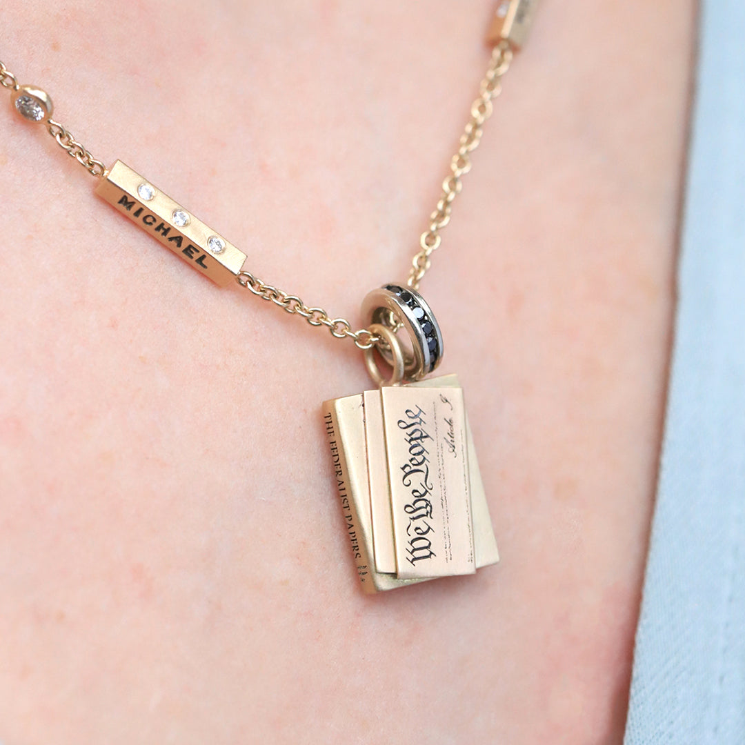 This charm features The Federalist Papers book with the United States Constitution resting on top. Crafted in precious metals, this charm represents freedom, knowledge and the hope of the people. Each charm features fine detailing on the spine and top. Sterling Silver pages with 14K Gold Covers.