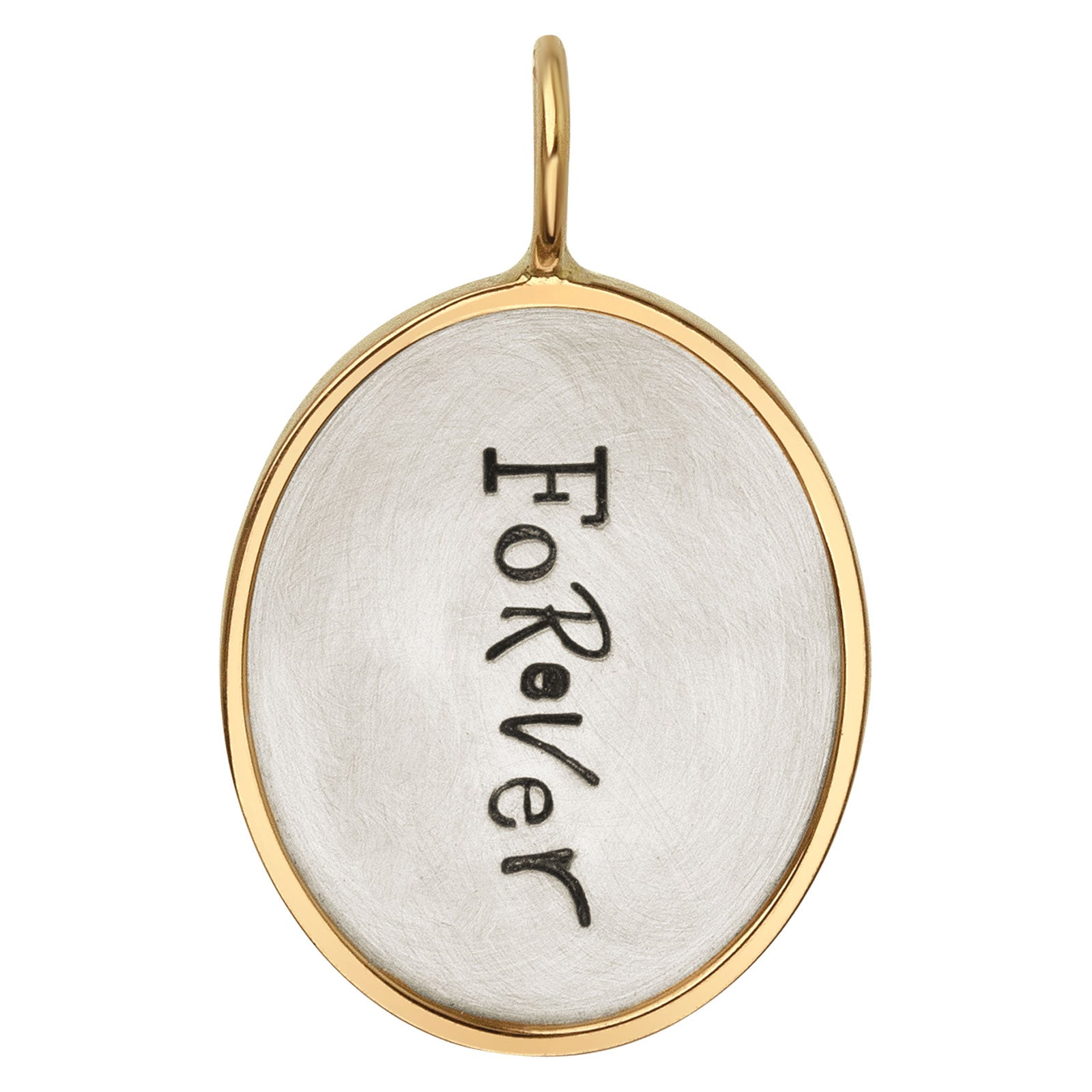 Medium silver oval charm with a yellow gold frame on the front and back, three 1mm and two 1.5mm white diamonds. Hand stamped with "You + Me" on front and "Forever" on the back.