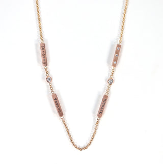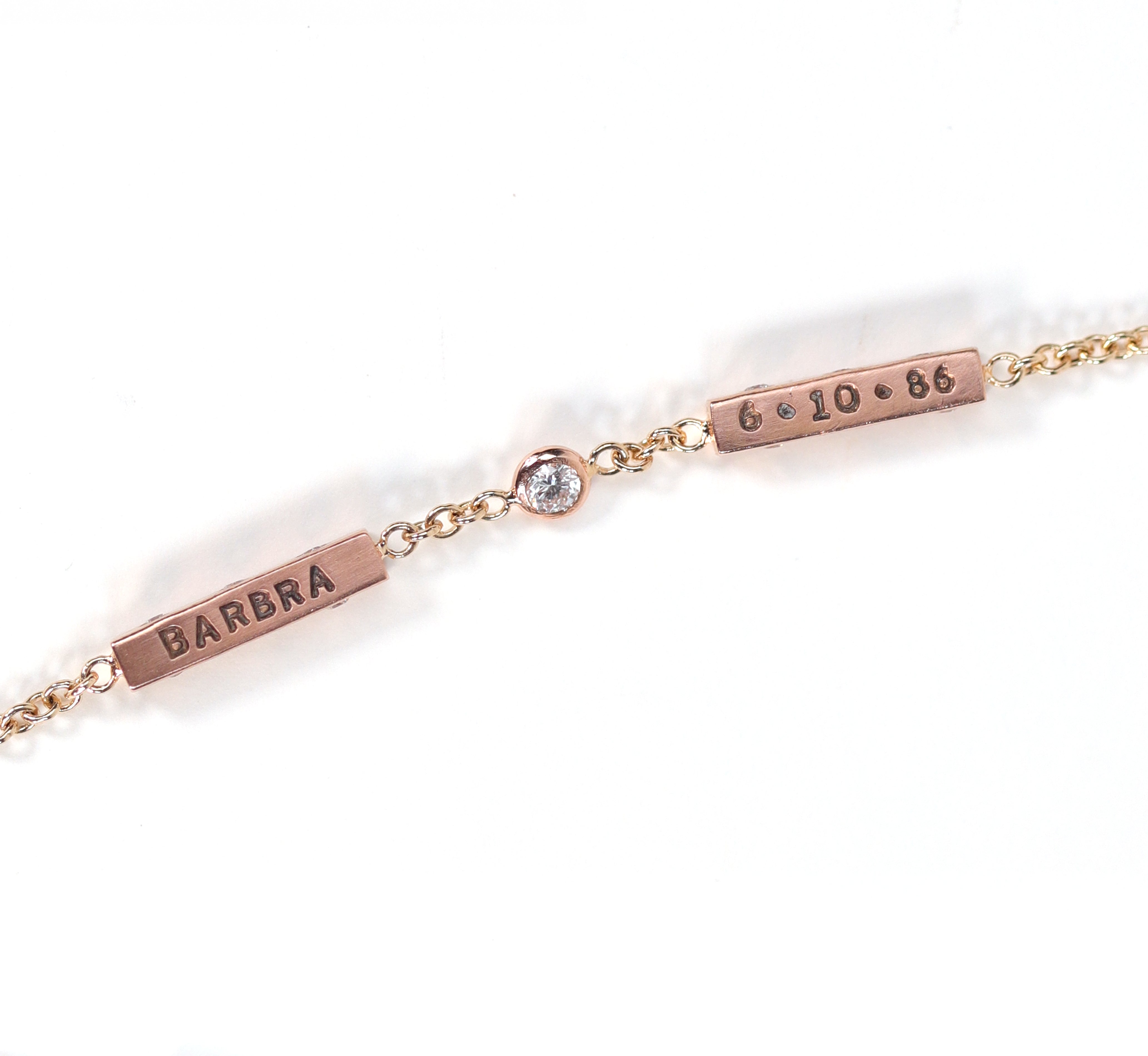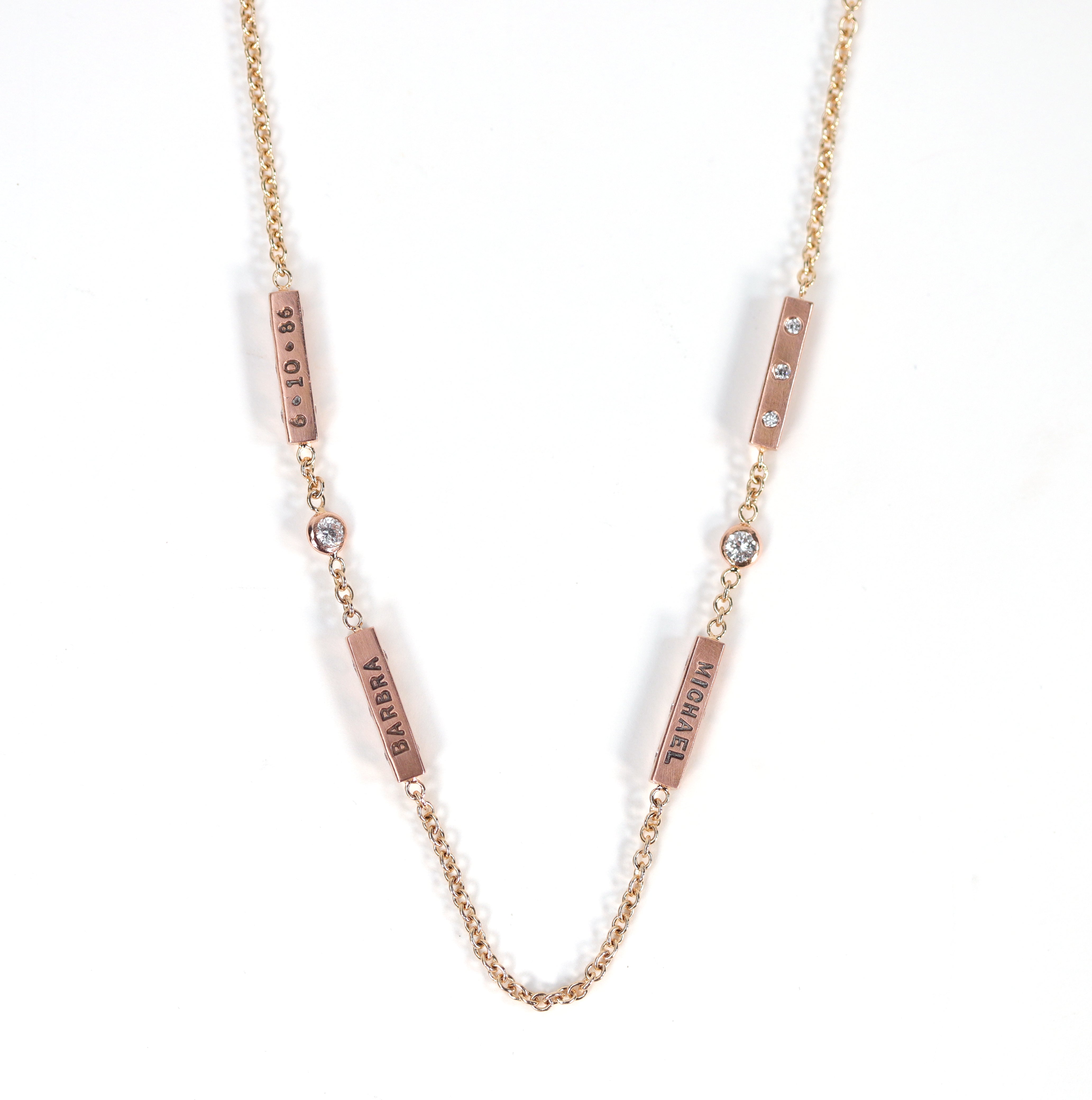 Get the perfect statement piece with a distinctive look to stand out from the crowd. Adorn yourself with this exquisite 2mm Name and Date Chain. Hand-crafted in solid 14k gold and accented with two white diamond bezels, this 18-inch chain is personalized with up to four gold bars adorned with diamonds, a name, and a date on each.