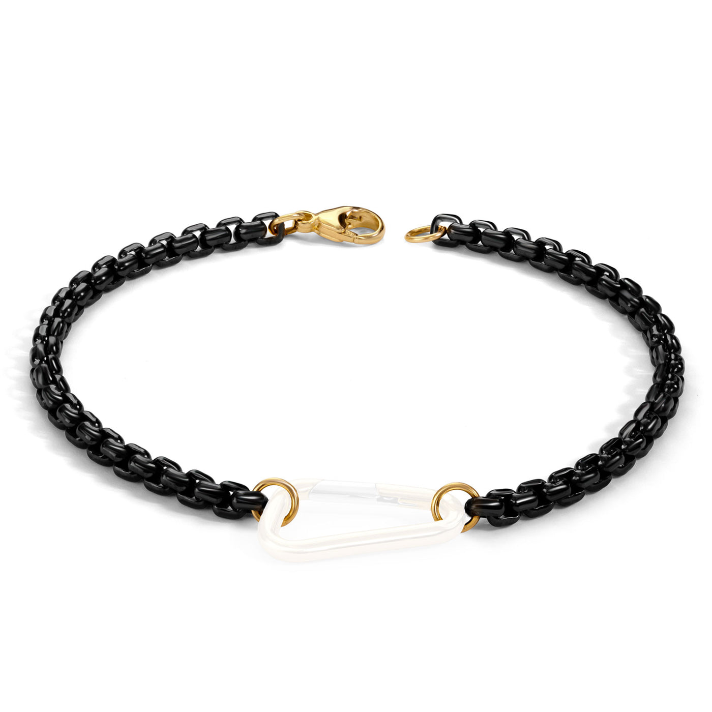 4mm stainless steel black chain hinge bracelet with yellow gold hardware. Should you need a custom length, please contact us.