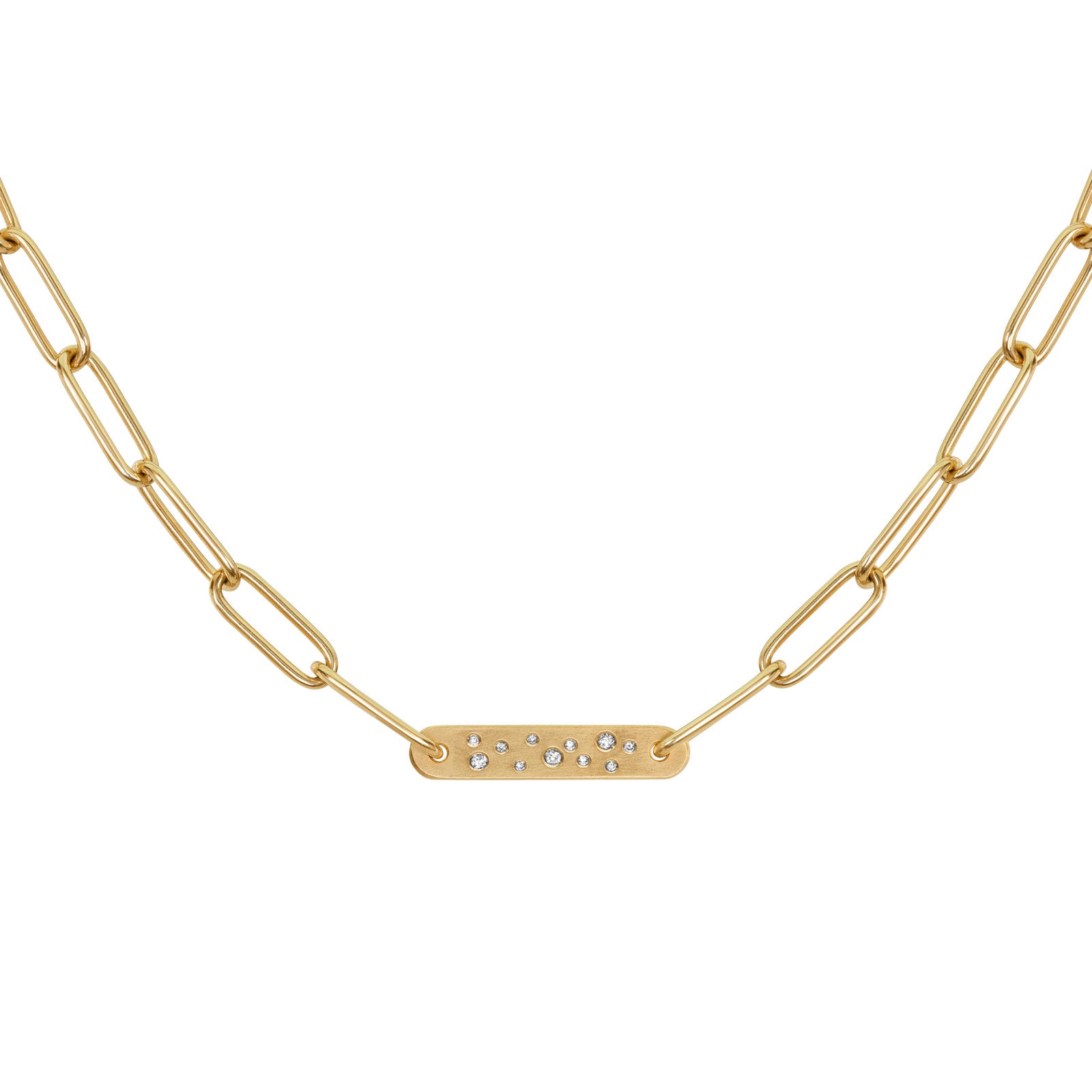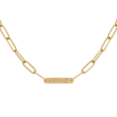 5.2mm yellow gold link chain with a large yellow gold flat bar, scattered with white diamonds.
