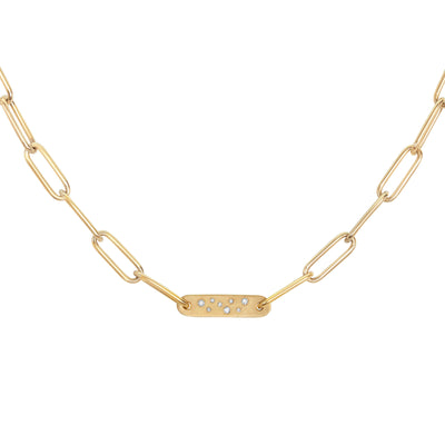 5.2mm yellow gold link chain with a small yellow gold flat bar, scattered with white diamonds.