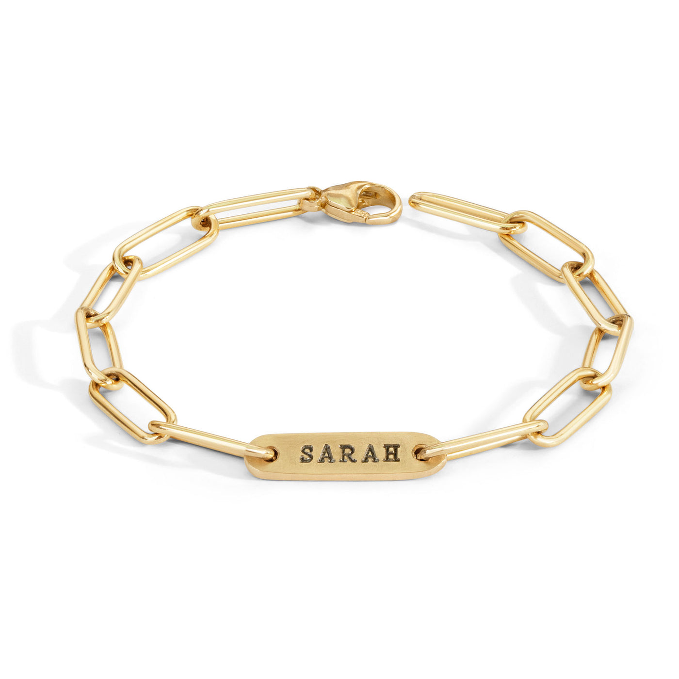 5.2mm yellow gold link bracelet with a small yellow gold flat bar. Hand stamped with a name.