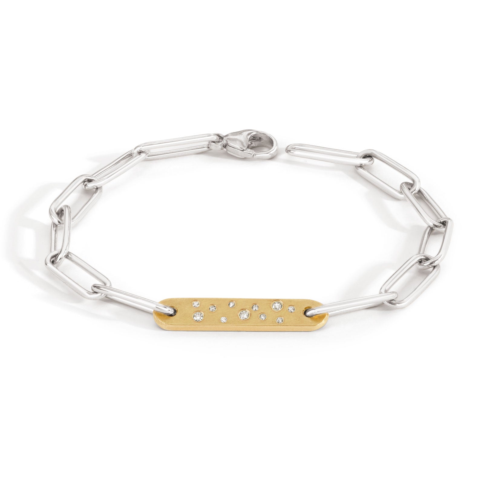 5.2mm silver link chain with a large yellow gold flat bar, scattered with white diamonds.