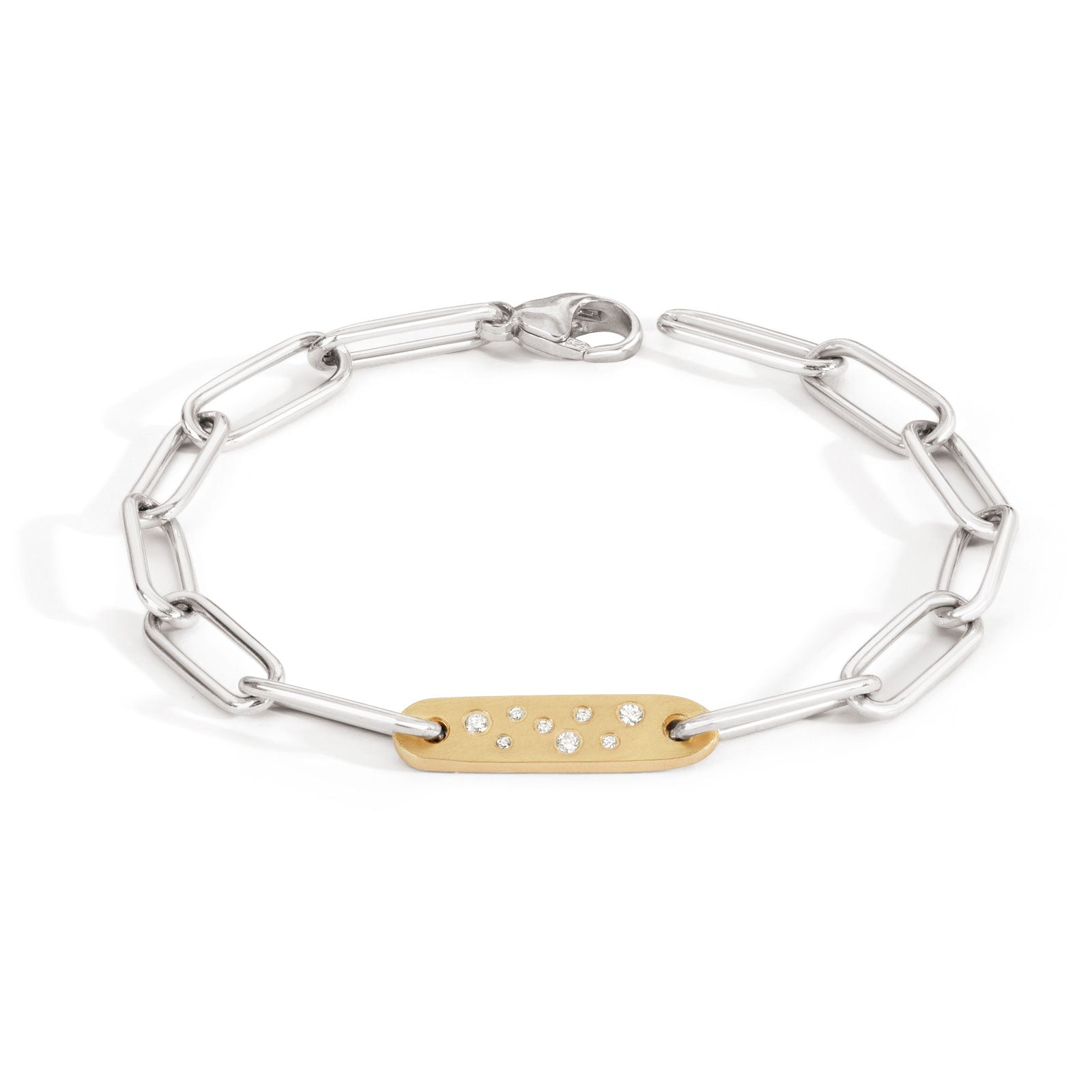 5.2mm silver link bracelet with a small yellow gold flat bar, scattered with white diamonds.