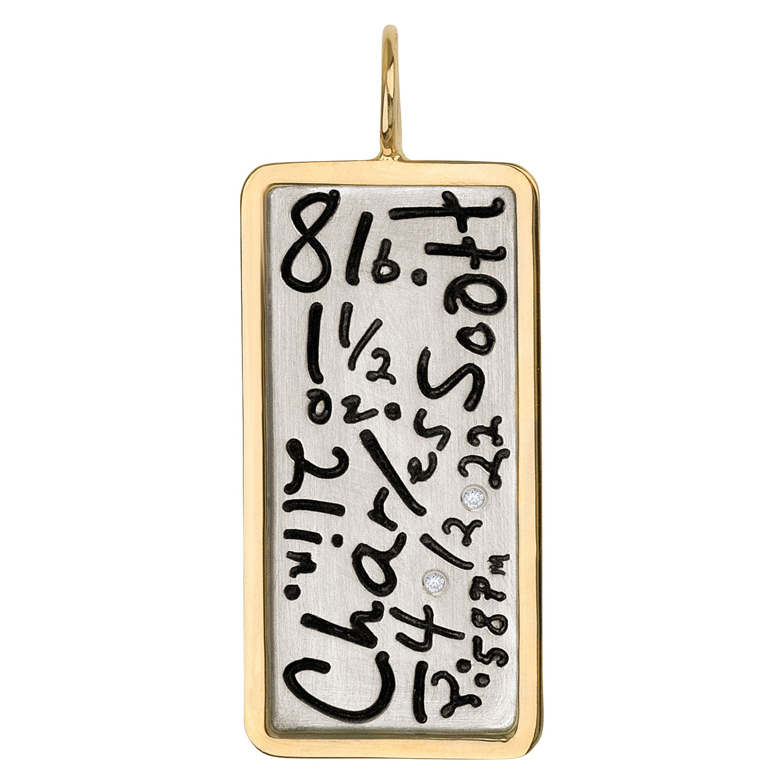 Medium silver ID tag with a yellow gold frame and two 1mm white diamonds. Hand stamped with baby name and stats in a graffiti layout.
