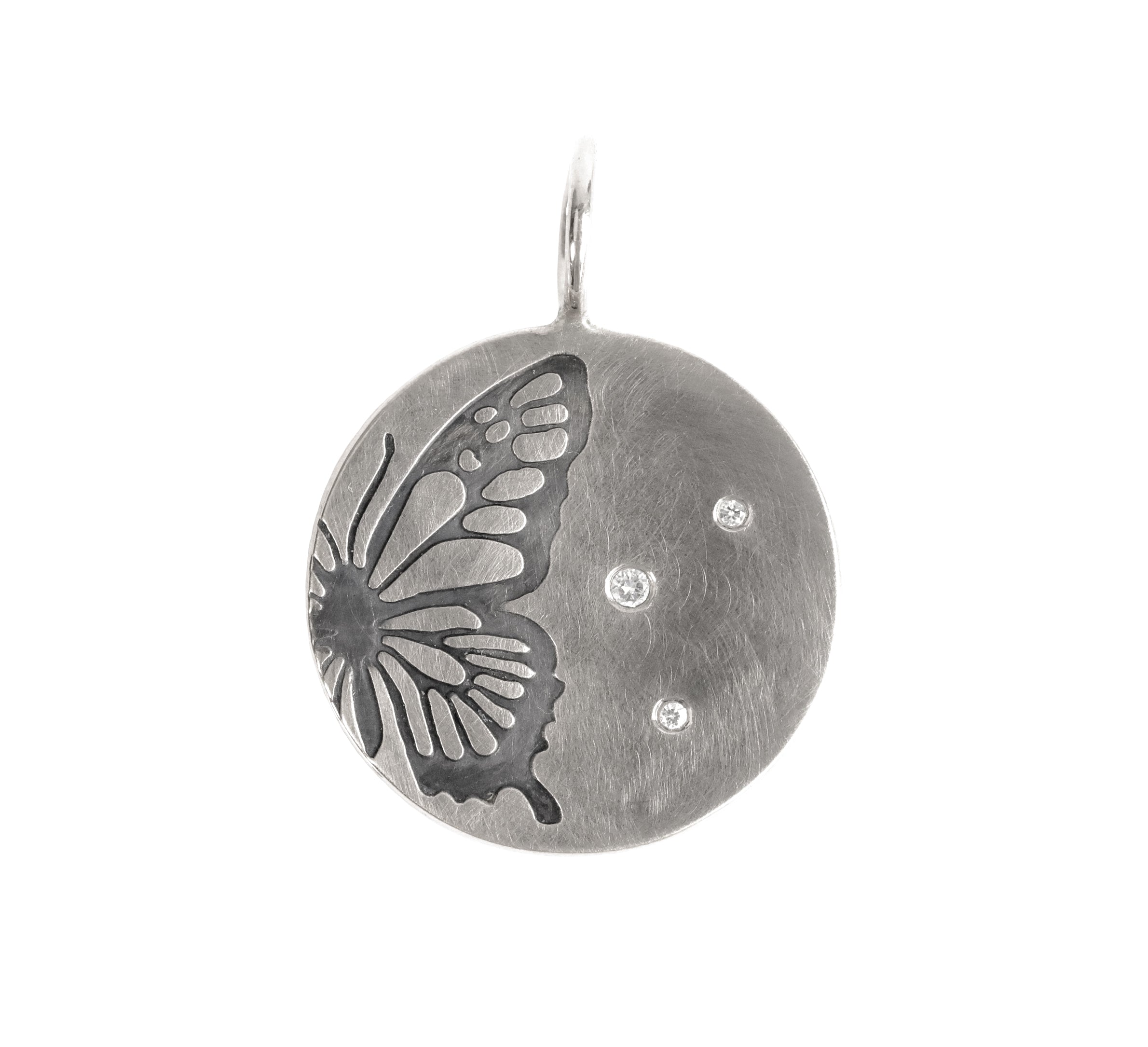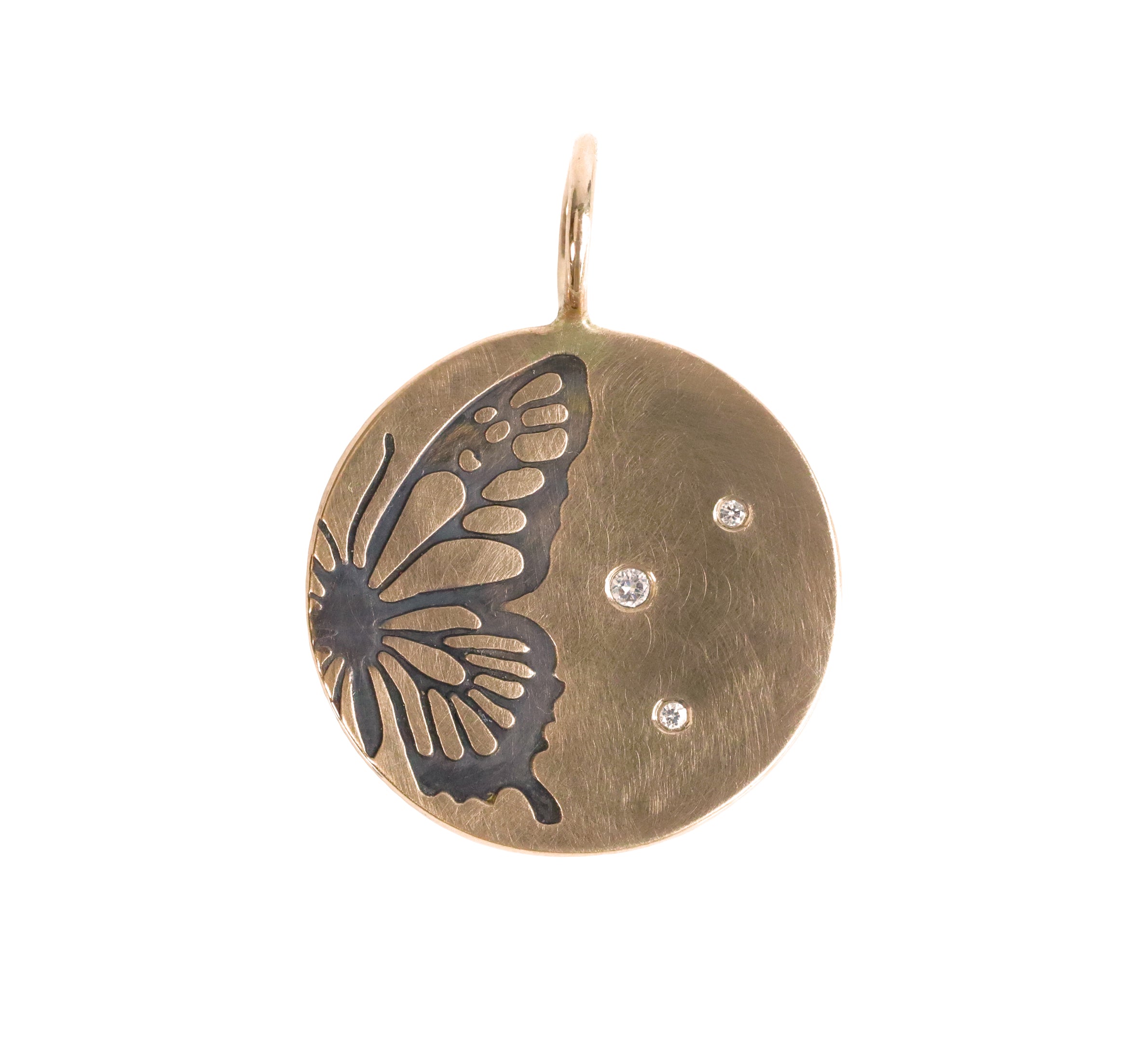 This charming round charm is a celebration of springtime and nature. Hand-stamped with a detailed butterfly wing to one side, and a small scatter of white diamonds on the other. Crafted from either 14k yellow gold or sterling silver, it exudes a sense of luxury and elegance that will add a touch of nature-inspired beauty to any outfit.