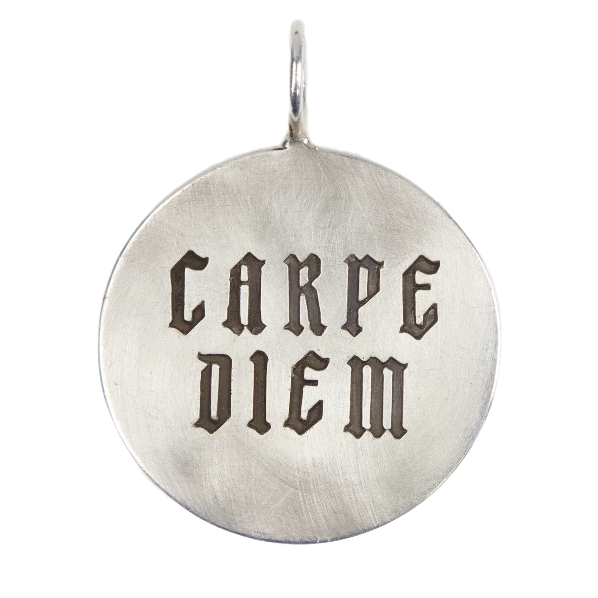 Looking for a little extra motivation. Look no further than our "Carpe Diem" round charm hand stamped with our brand new Renaissance font. This stunning piece is available in sterling silver or high polished 14k yellow gold. An excellent motivator to add to any collection.