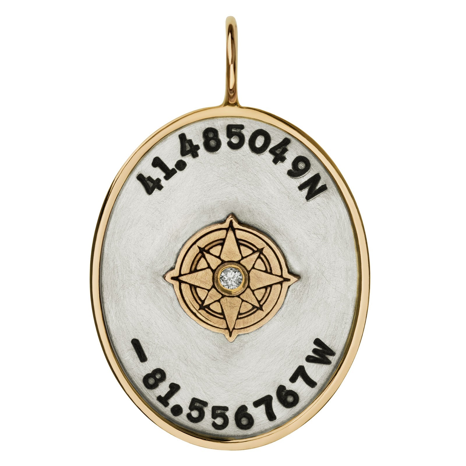 Large silver oval charm with a yellow gold frame, yellow gold stamped raised compass rose, and one 2mm white diamond. Hand stamped with the latitude and longitude of Cleveland Heights.