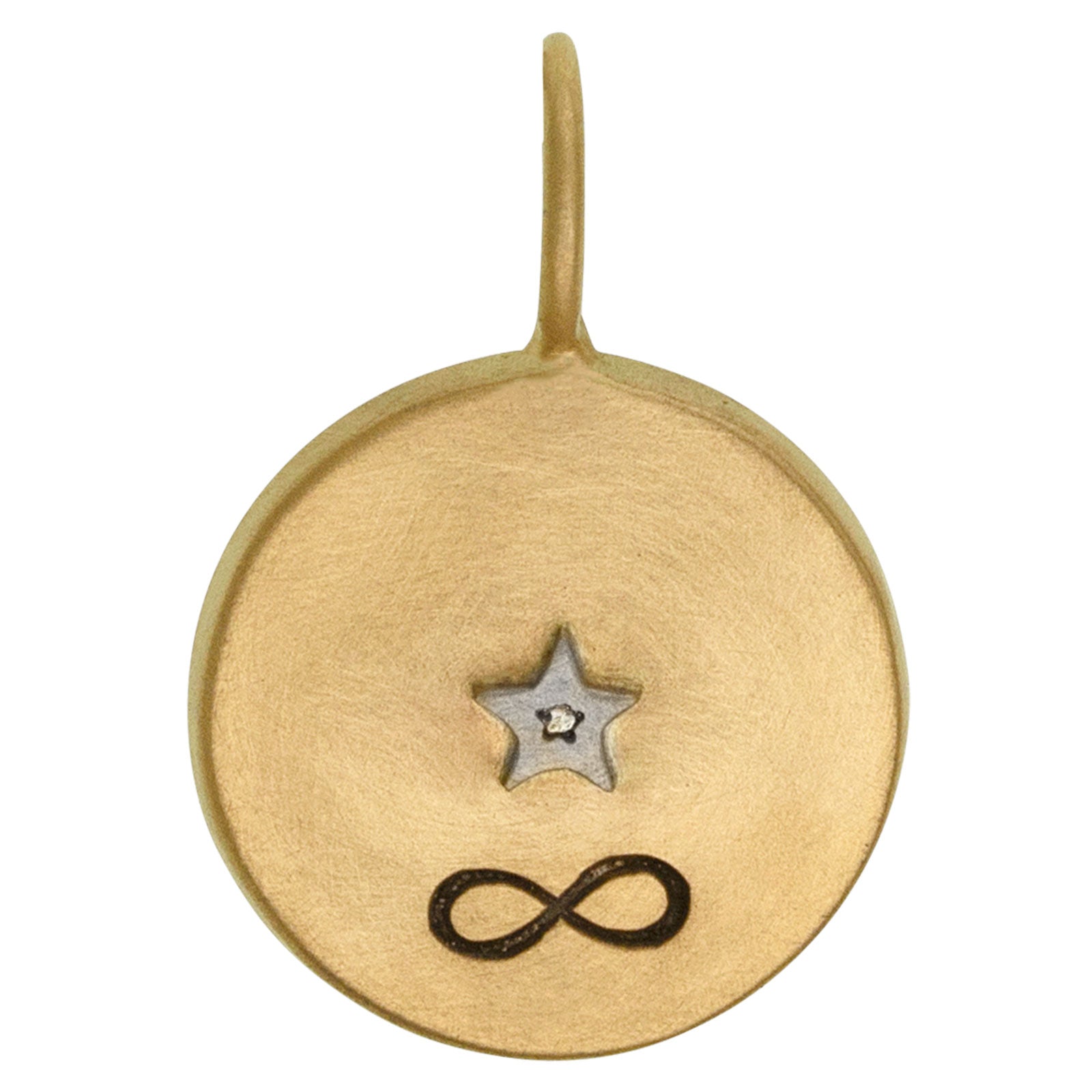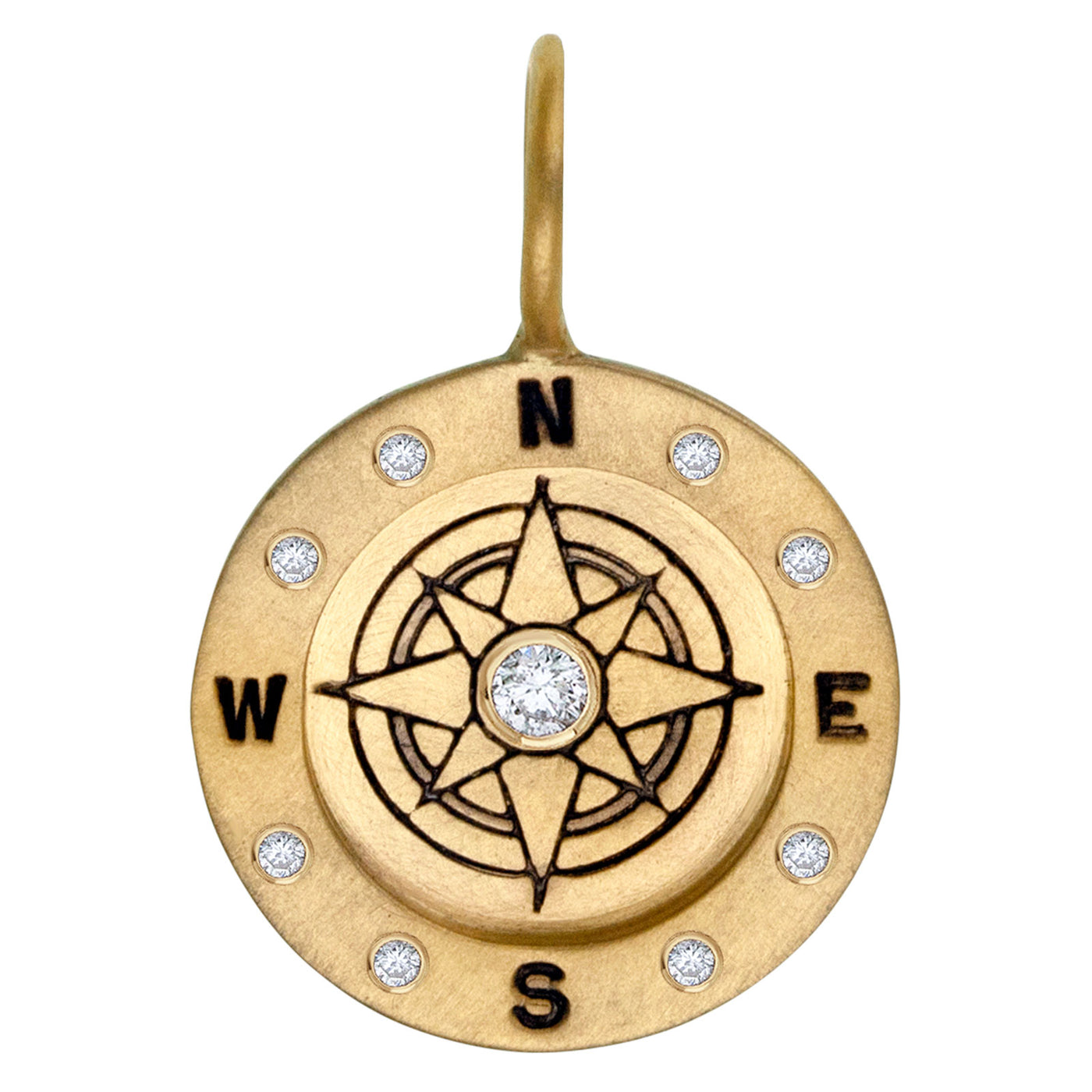Our handmade round charm is the perfect piece to capture your adventurous spirit. Crafted from 14k yellow gold and a yellow gold frame, the compass rose features directional markers of NESW on the frame. Adorned with white diamonds, plus a 14k white gold open star & infinity symbol stamped on the back, this charm will surely be a conversation starter.