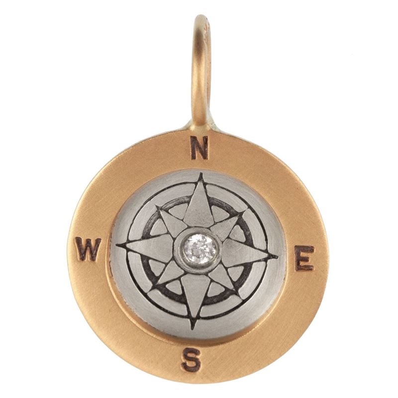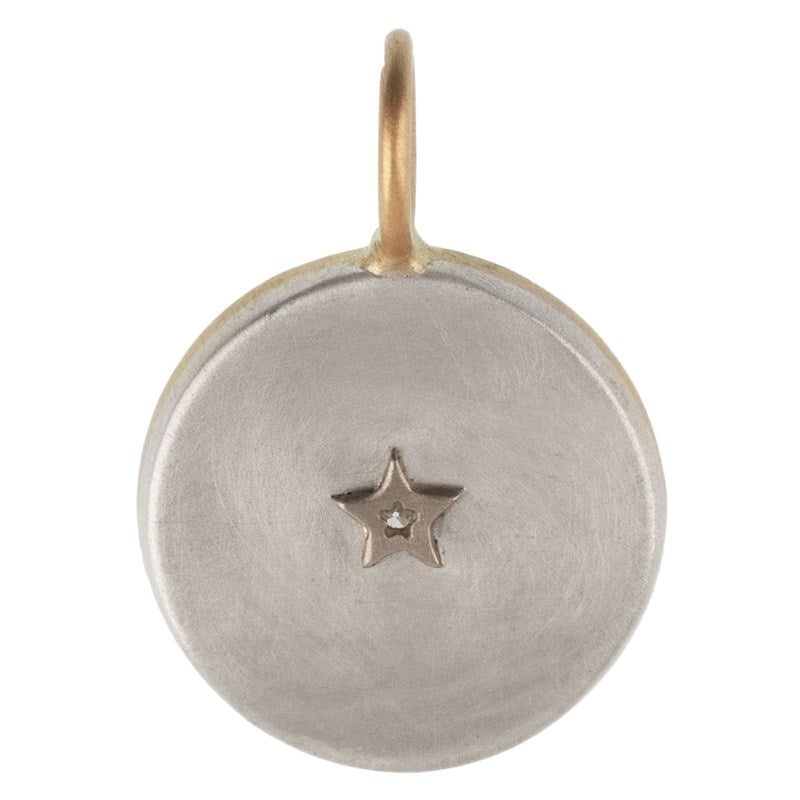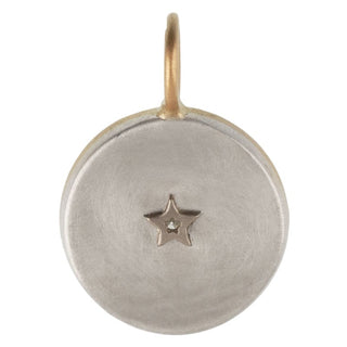 Small silver round charm with a yellow gold wide frame, 2mm white diamond, and a white gold hollow star on the back. Hand stamped with a compass rose and "NESW" on the wide frame.