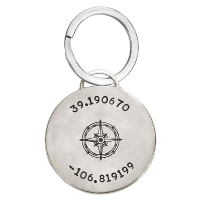 Silver round keychain. Hand stamped with an ornate compass rose and coordinates.