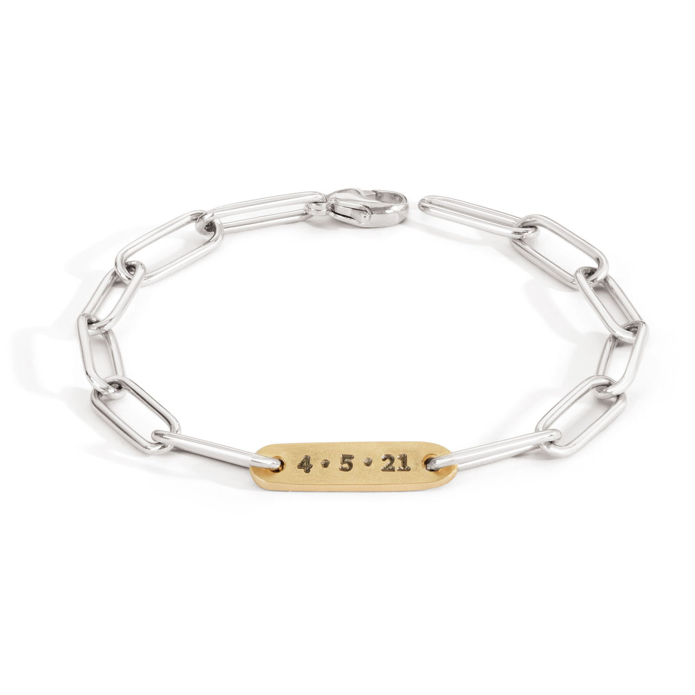 5.2mm silver link bracelet with a small yellow gold flat bar. Hand stamped with a date.