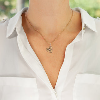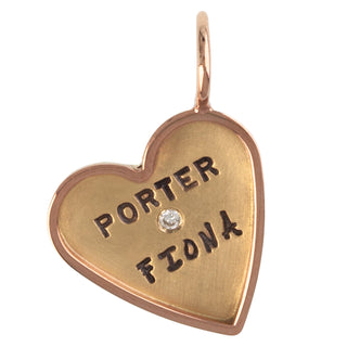 Small yellow gold heart charm with a rose gold frame and 1.5mm white diamond. Hand stamped with two names.