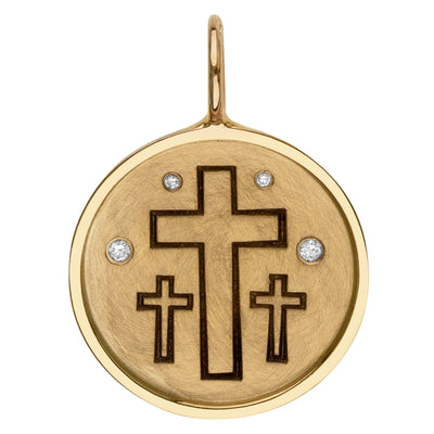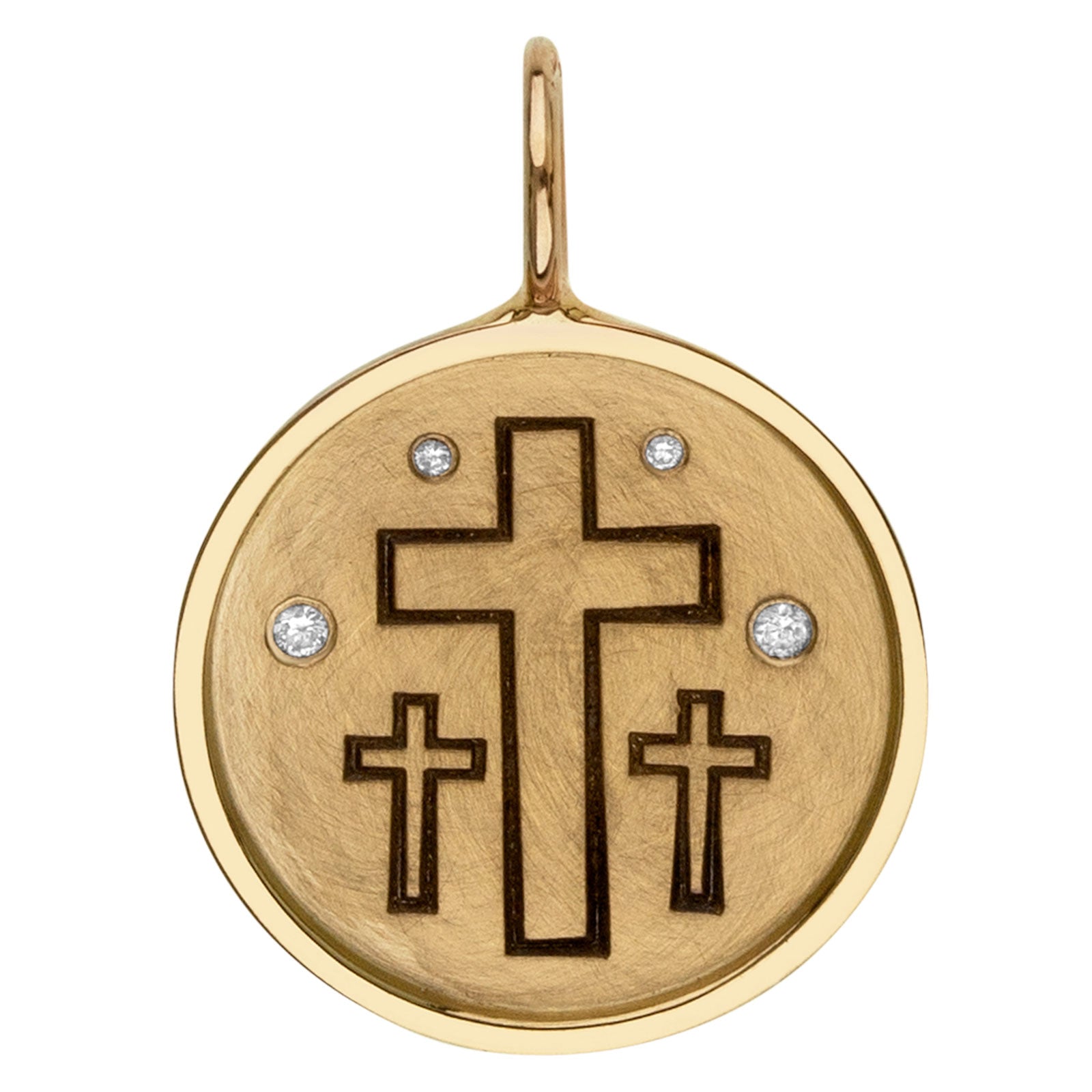 Medium yellow round charm with a yellow gold frame, with two 1mm and two 1.5mm white diamonds. Hand stamped with two small simple crosses and a medium simple cross in the center.