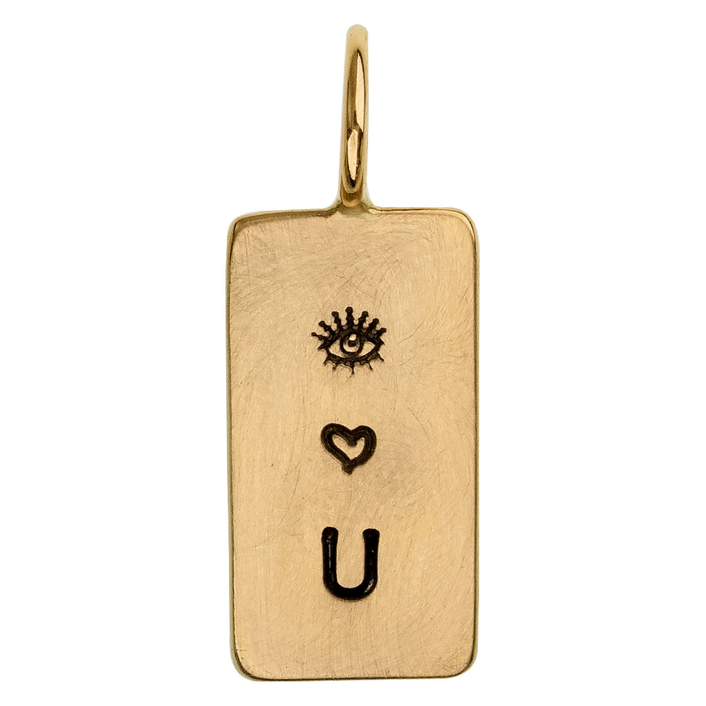 Mini yellow gold ID tag. Hand stamped with the Evil Eye, small heart and the letter "U".