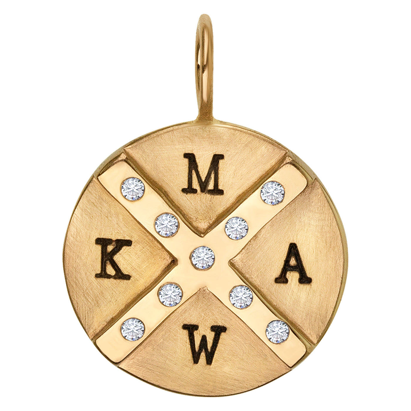 Medium yellow gold round charm with nine 1.5mm white diamonds in a yellow gold high polished raised cross. Hand stamped with four initials.
