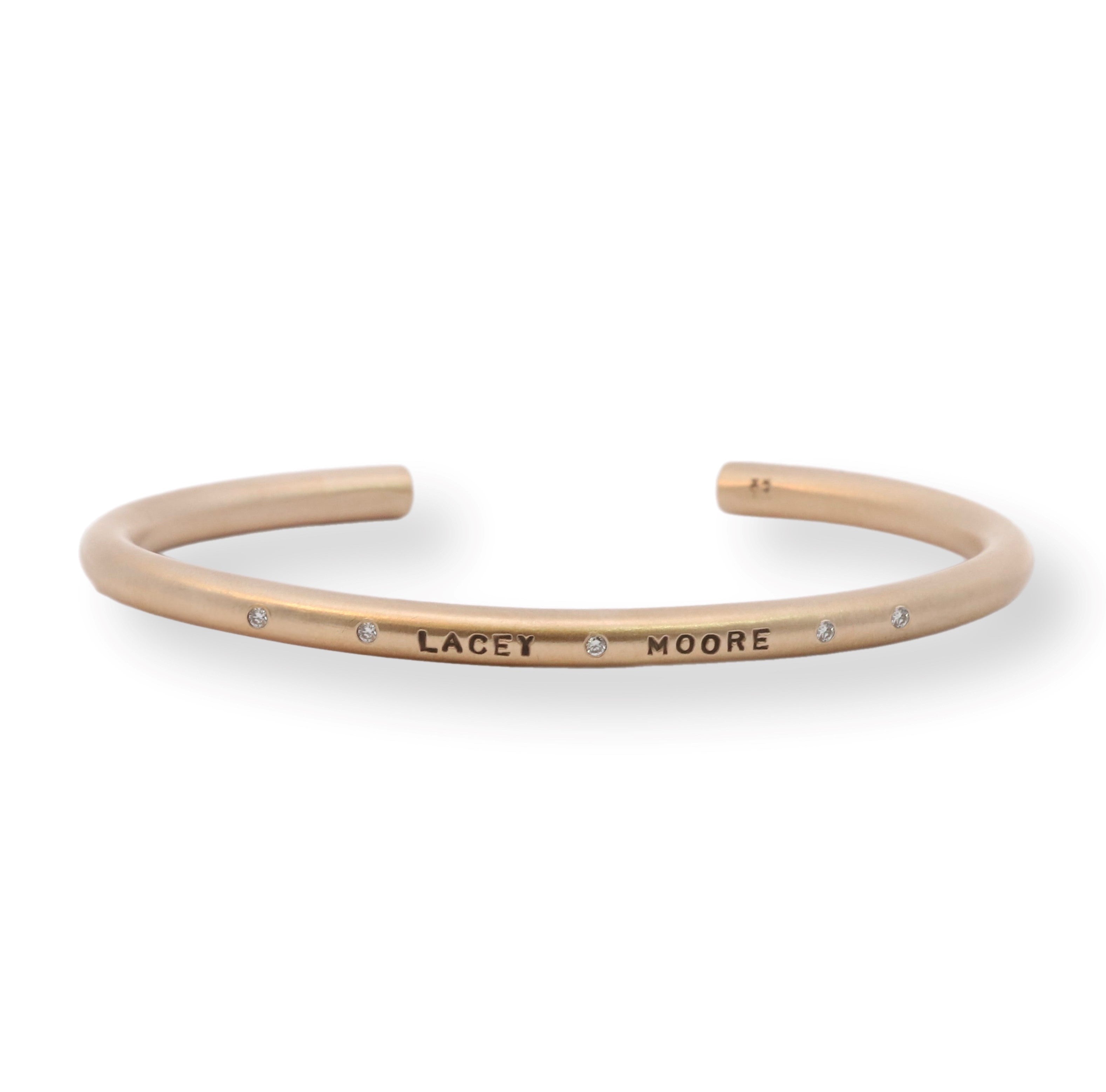 Yellow gold round cuff stamped with two names and baby stats on the inside.