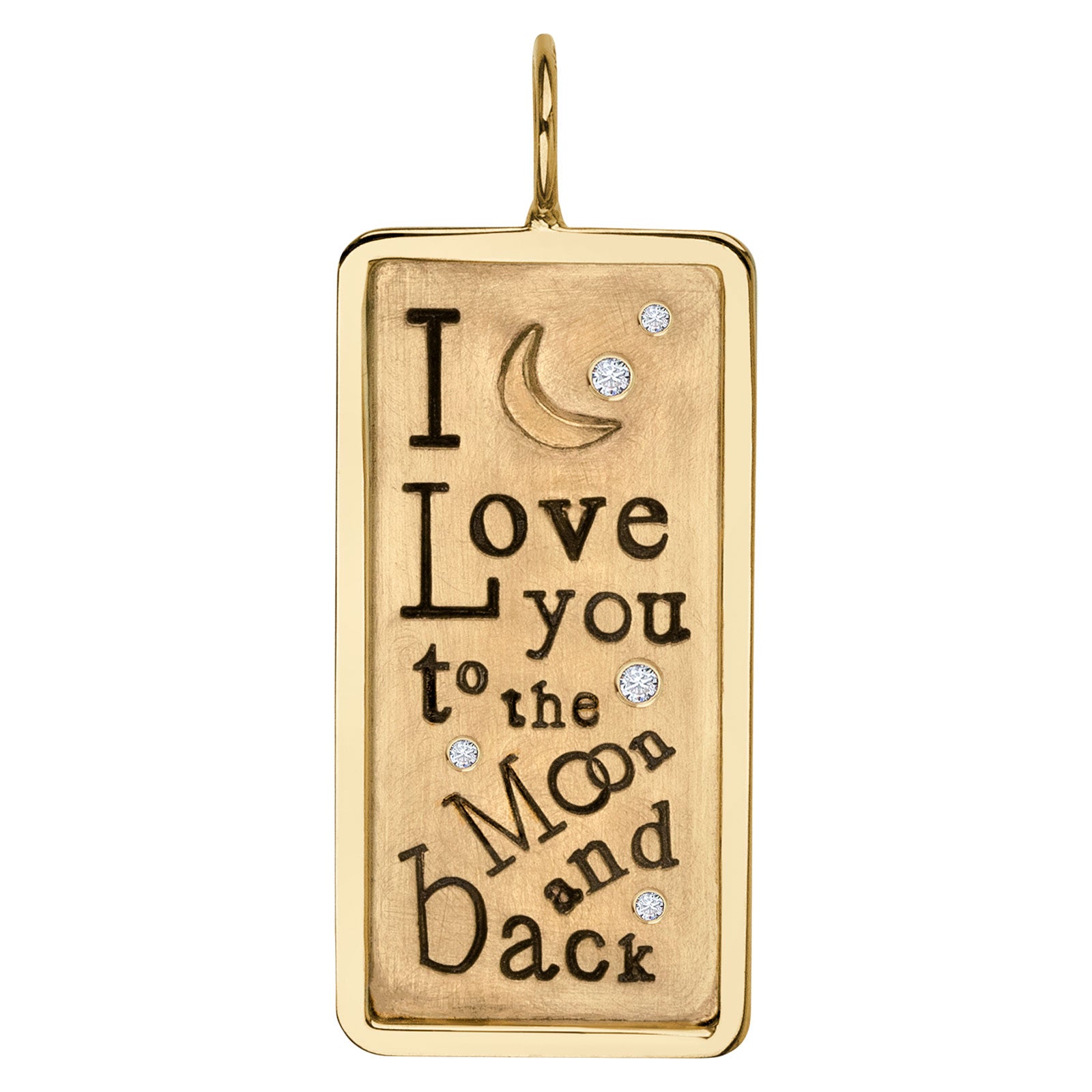 Medium yellow gold ID tag with a yellow gold frame, a yellow gold raised moon, three 1mm and two 1.5mm white diamonds. Hand stamped with "I love you to the moon and back".