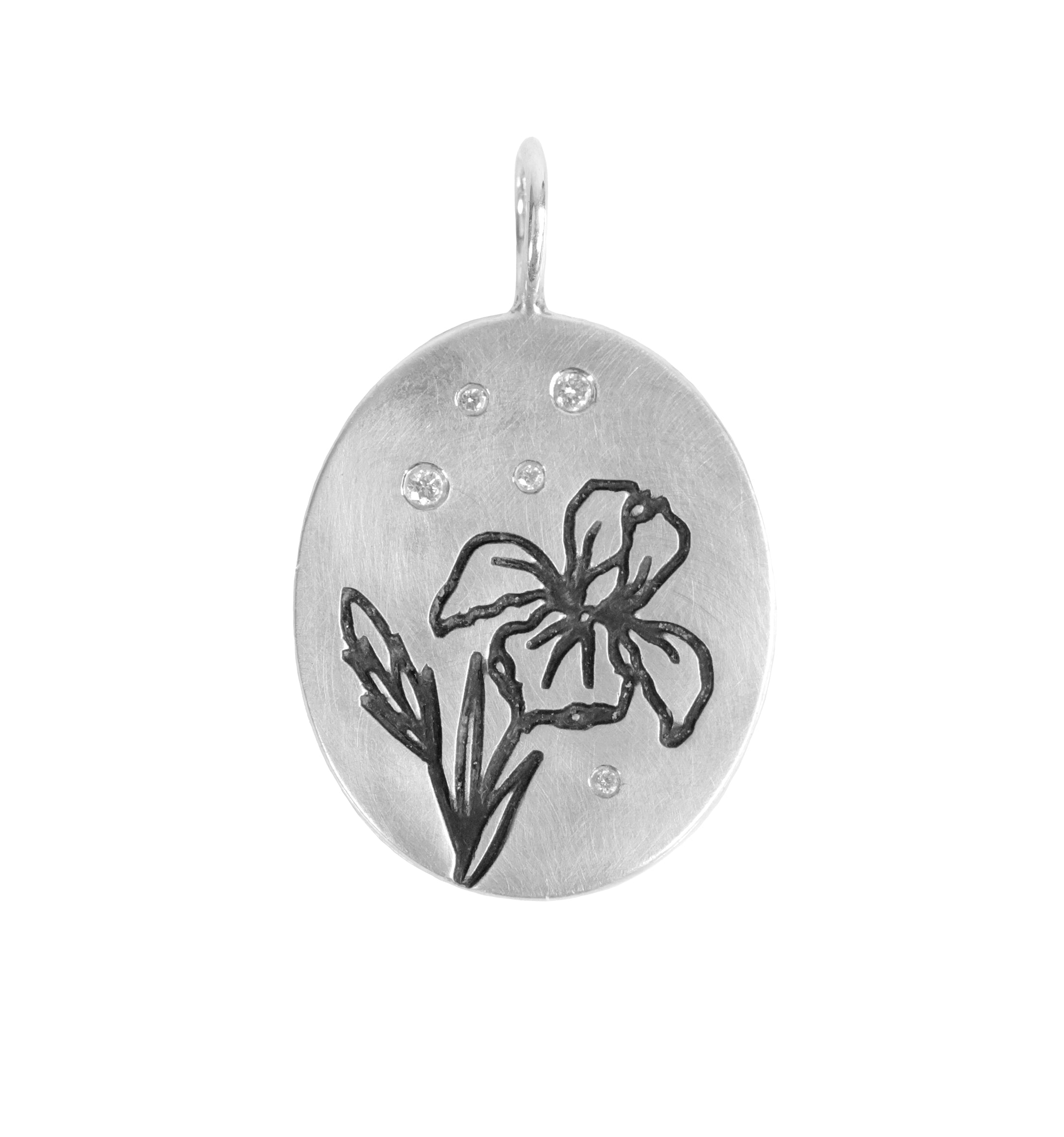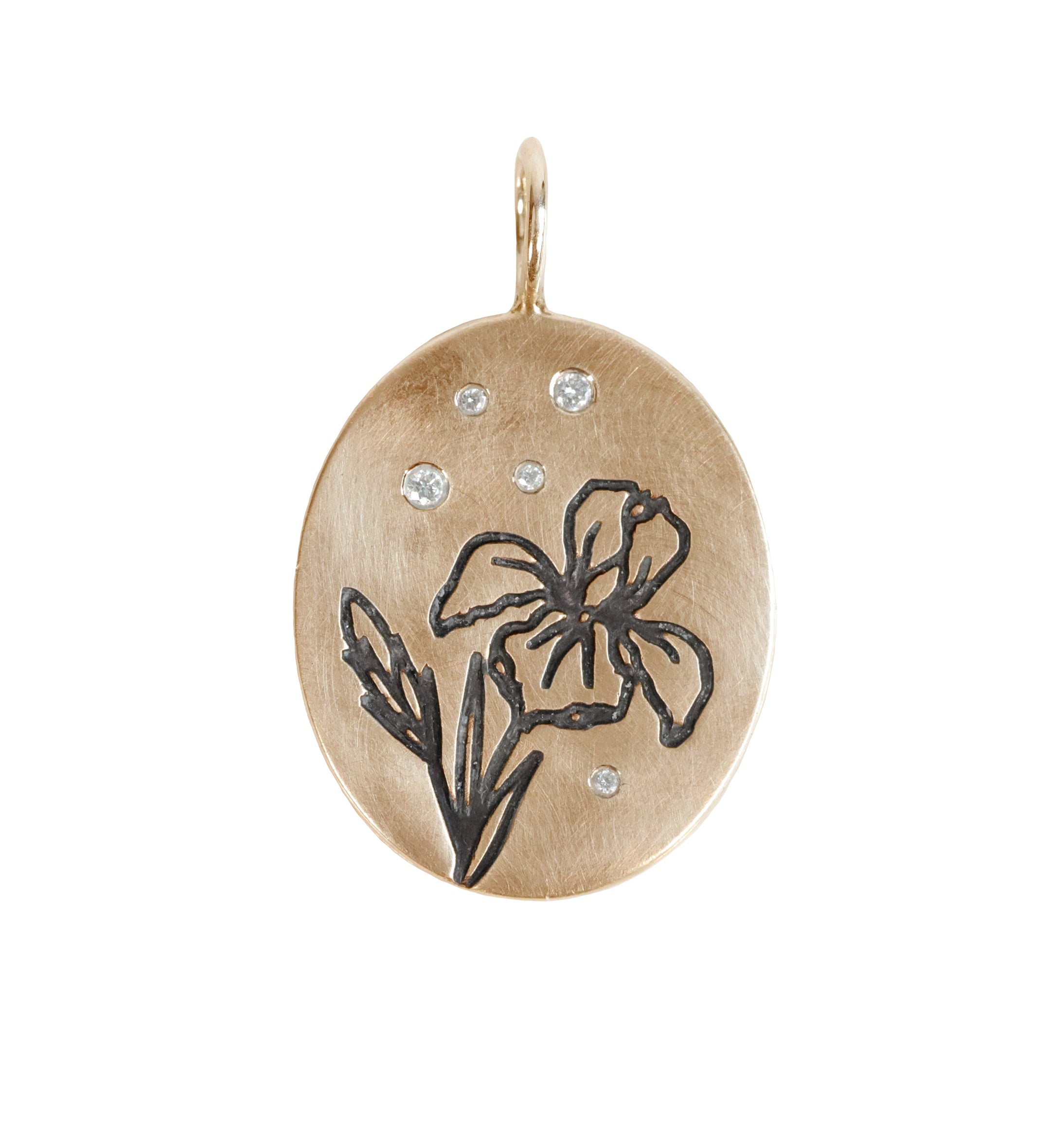 This charming oval charm is a celebration of springtime and nature. Hand-stamped with a beautiful iris, and accented with a sparkling cluster of white diamonds. Crafted from either 14k yellow gold or sterling silver, it exudes a sense of luxury and elegance that will add a touch of nature-inspired beauty to any outfit.