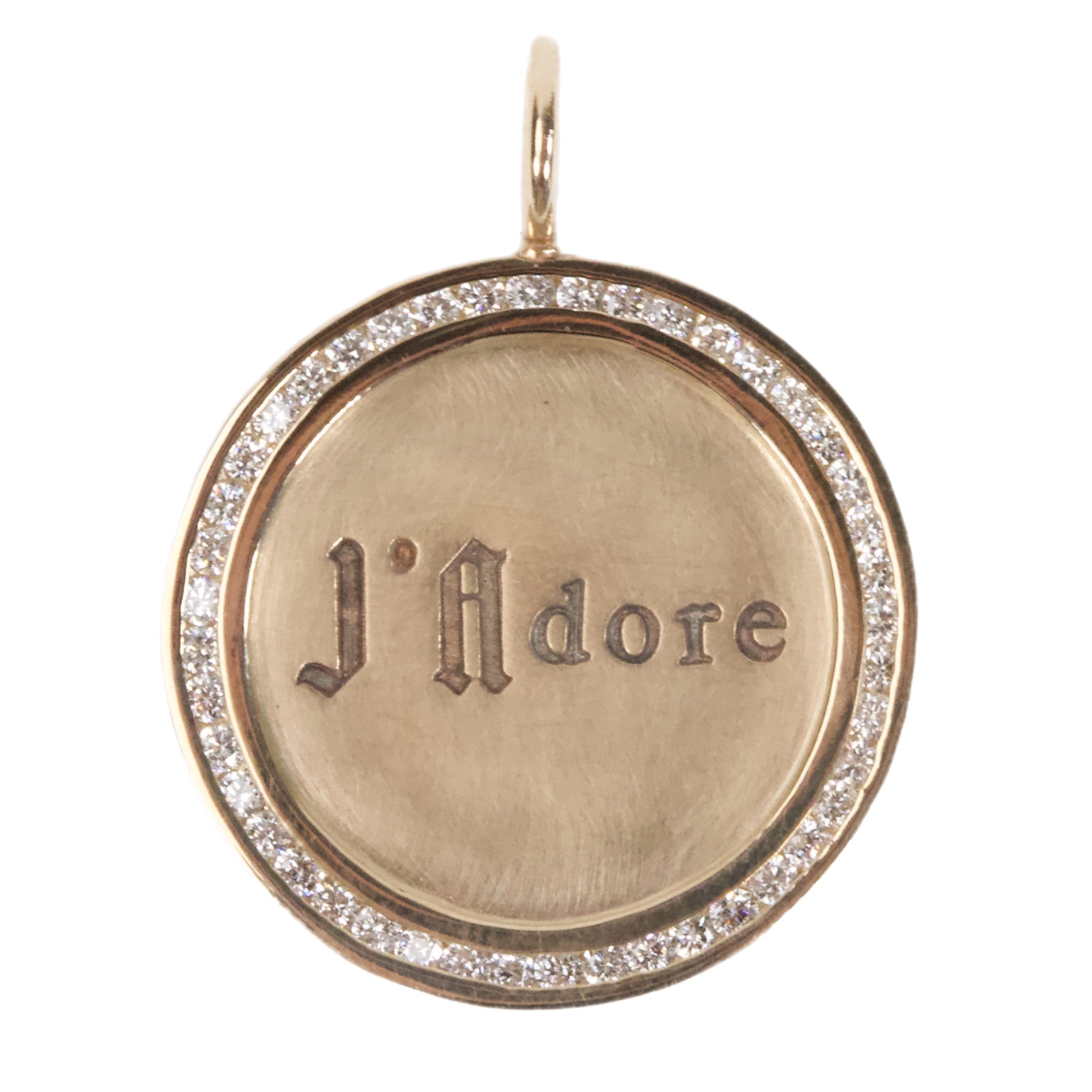 Medium yellow gold round charm with a yellow gold channel set frame with white diamonds. Hand stamped with "J'adore".