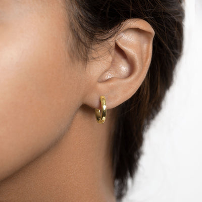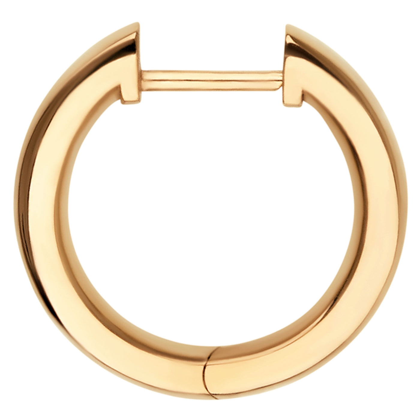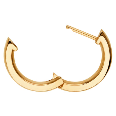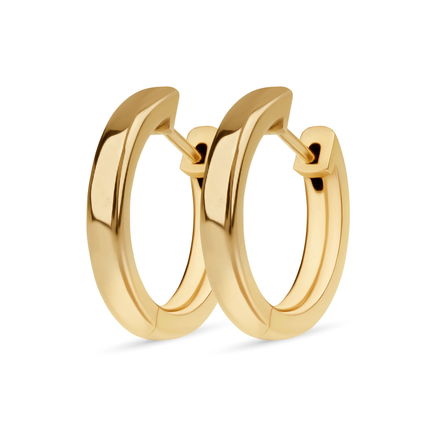 A pair of large yellow gold huggie earrings that hug the earlobe with a simple open and close hinge. Our yellow gold is lead and nickel free.